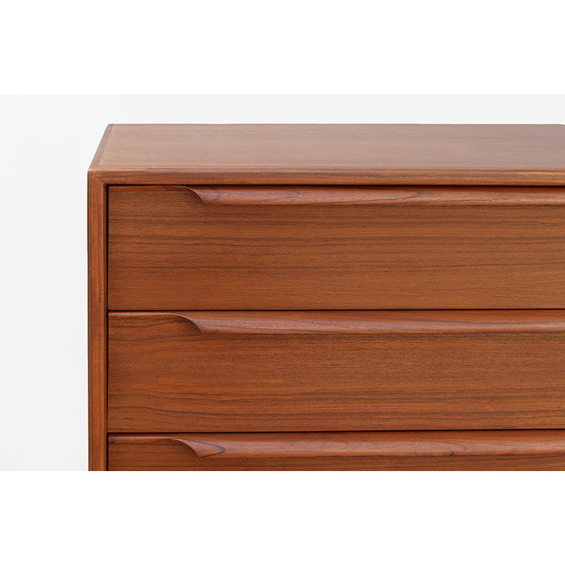 また、収納には大きな引き出しが3杯と、引き戸の中には取り外し可能な棚板が一枚付属しており、生活感の出やすい物をすっきりと片付けることができます。可動部のレールを木製にすることで開閉時の音がやさしく、使うほどに素材の心地よさを感じられます。引き出し内部もチーク材で仕上げるなど、細部にまで北欧ミッドセンチュリー家具の思想を落とし込み、素材・構造ともにこだわって作り上げたサイドボードです。
