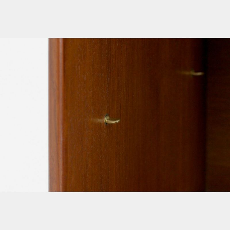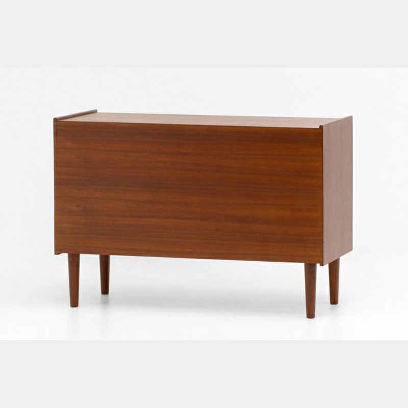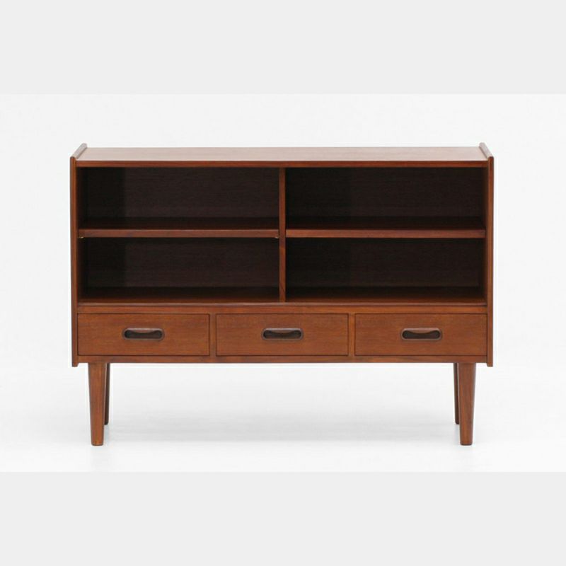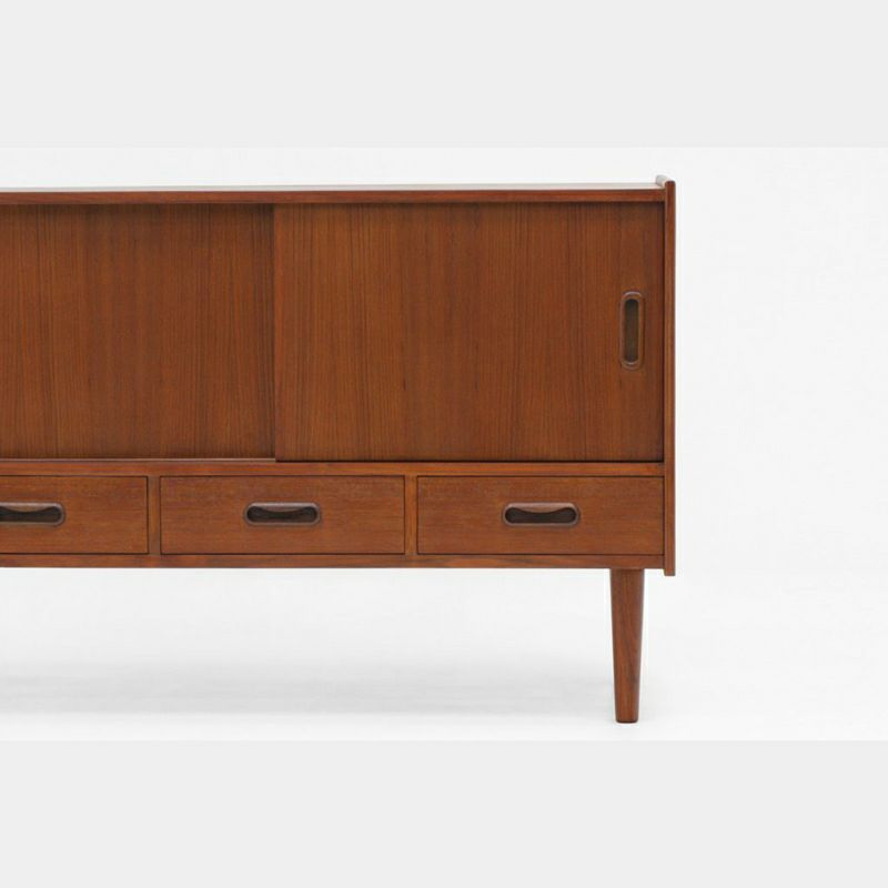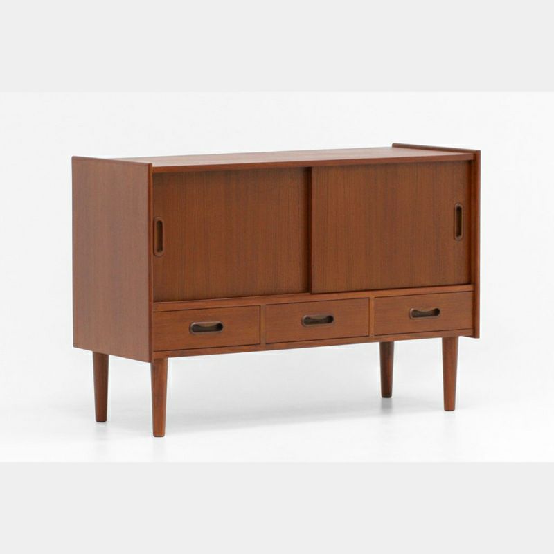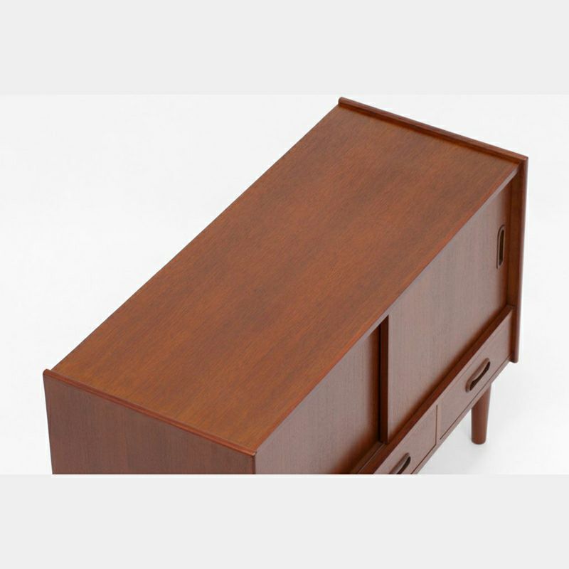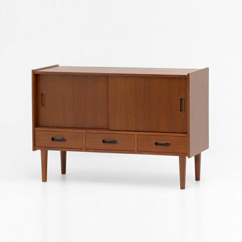 Klokkenシリーズのワイドキャビネットは、チーク材の木目が美しく、細長な脚と丸みのある取っ手が特徴です。低めの天板には雑貨や観葉植物などを飾り、見せる収納を楽しめます。小物の整理に役立つ引出しを備え、引戸内の棚は取り外しが可能で、効率良く収納できます。リヴィングはもちろん玄関先や階段下などにもおススメ。