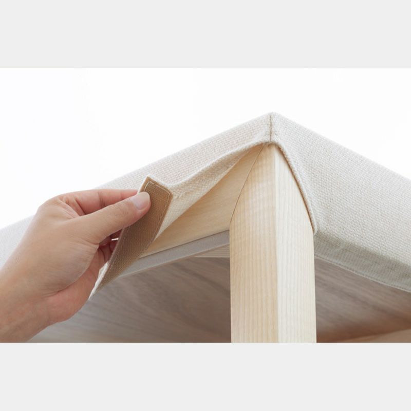 ジャケットはマジックテープで容易に着せ替えができ、布地でカジュアルに見せたり、革でフォーマルに見せたり。 お子さんがいる家庭など、ジャケットを着せれば天板に汚れや傷が付くこともなく、長く使うことができます。