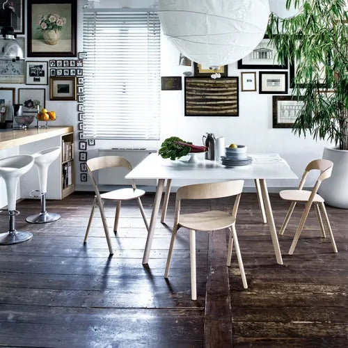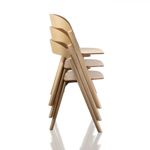 シンプルでモダンな木製チェアですが、座面裏のアルミパーツを構造材として見せることで、デザインアクセントとしています。