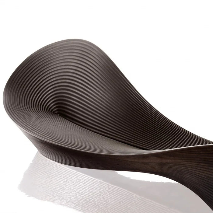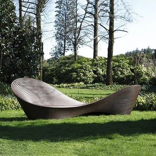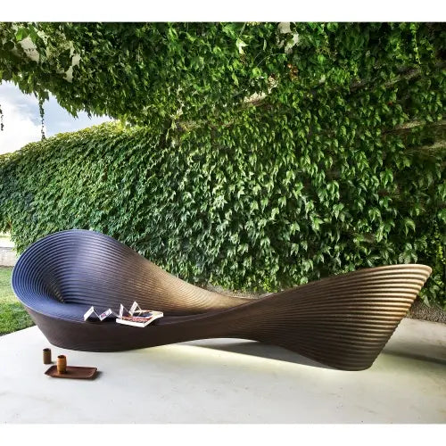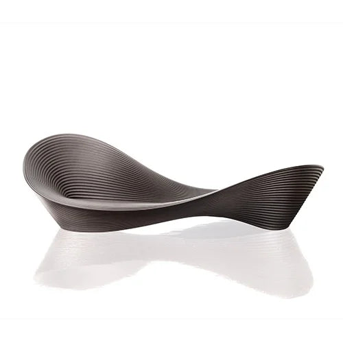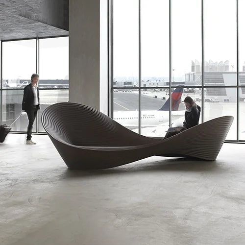 ダイナミックで柔らかな曲線が一際目を引く大型ベンチ。 ポリエチレンの回転成型によって造られたこのベンチは、8~10人の人が座ることができる。 また、カラーもラストブラウン=さび茶色で、屋内・屋外どちらの空間にもなじむ落ち着いた色みとなっている。