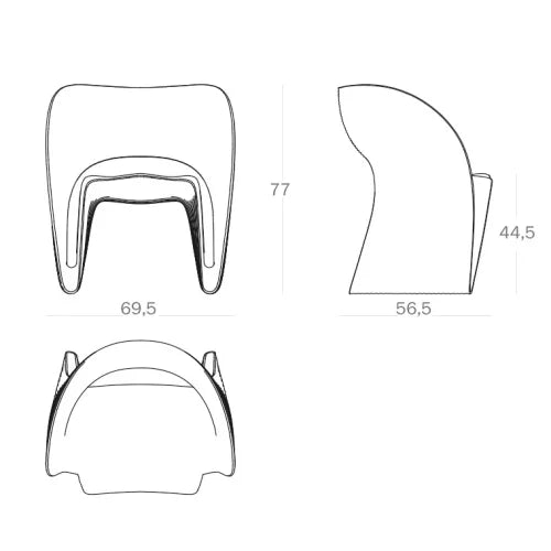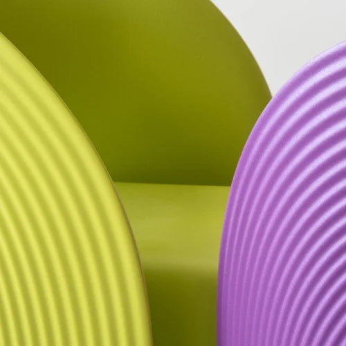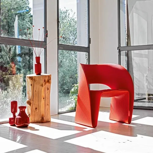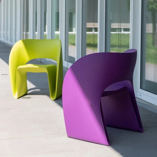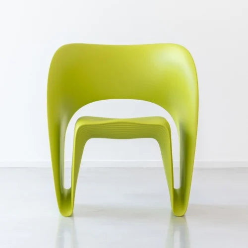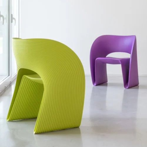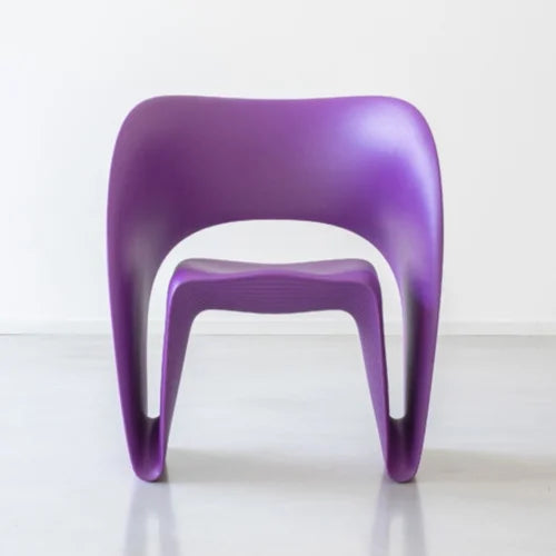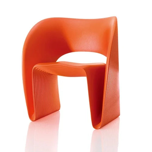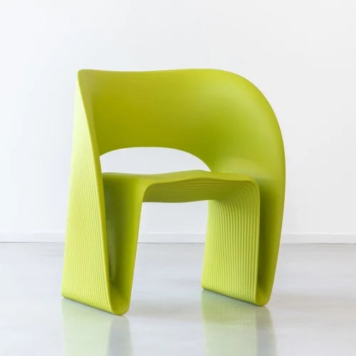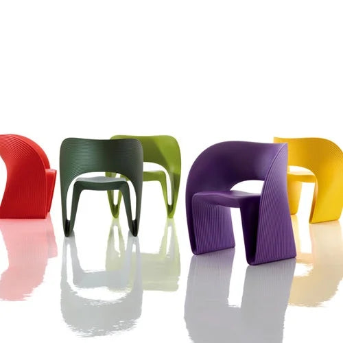 具の詰まったパスタ、ラビオリを連想させる柔らかなふくらみを持ったチェア。樹脂を回転の遠心力によって成型する回転成型法は、ダイナミックな造形が可能であると同時に、型どりの問題から作れる形に制限があるため、数々の試行錯誤を重ねた結果、このリボンがループする形に行き着きました。オブジェのように印象的な形でありながら、体をホールドする背もたれ部分は掛けやすく実用的です。屋外でも使用可能です。 存在感満点なので、一台あるだけで部屋のイメージをガラリと変えるでしょう。屋外でも使えます。 体を包み込むような形の背もたれで優しい座り心地。