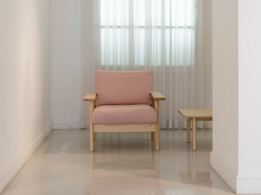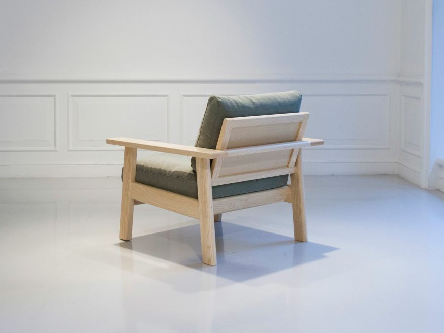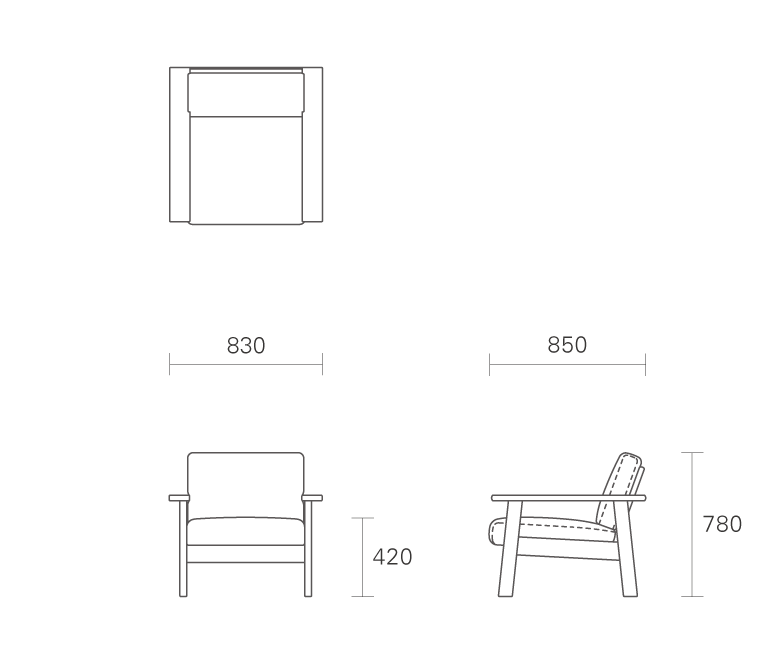 座り心地や快適さを考慮した木の構造体そのものが、さりげなく美しいフォルムを形成しています。横から見た時に八の字に開いた前後の脚を橋のように支えている肘掛けの構造は、美しさの中にダイナミックな印象ももたらしています。