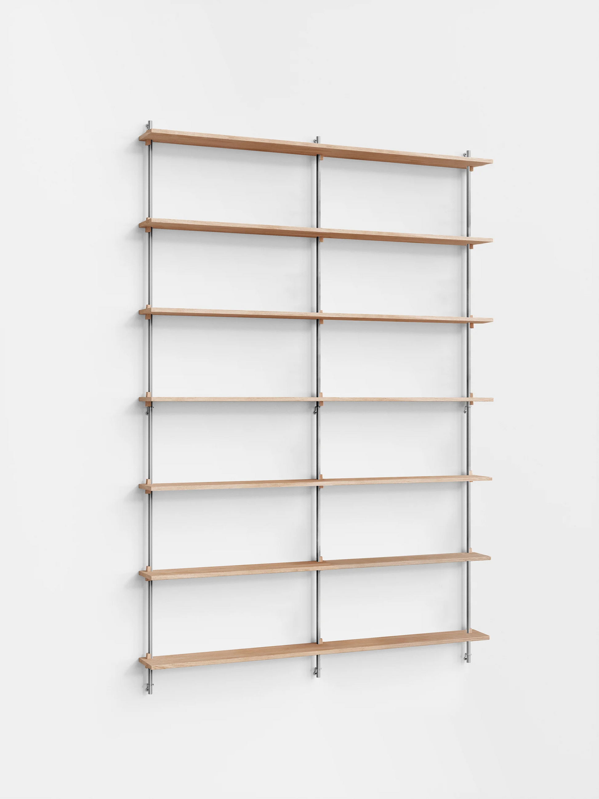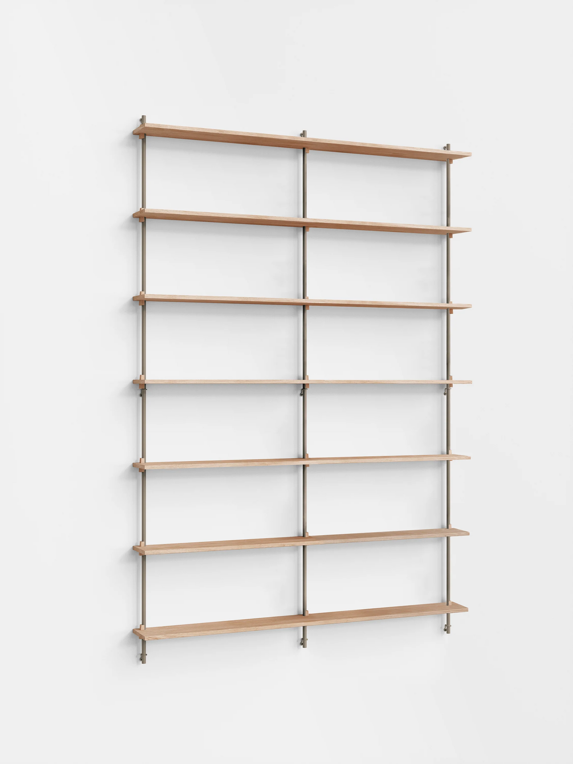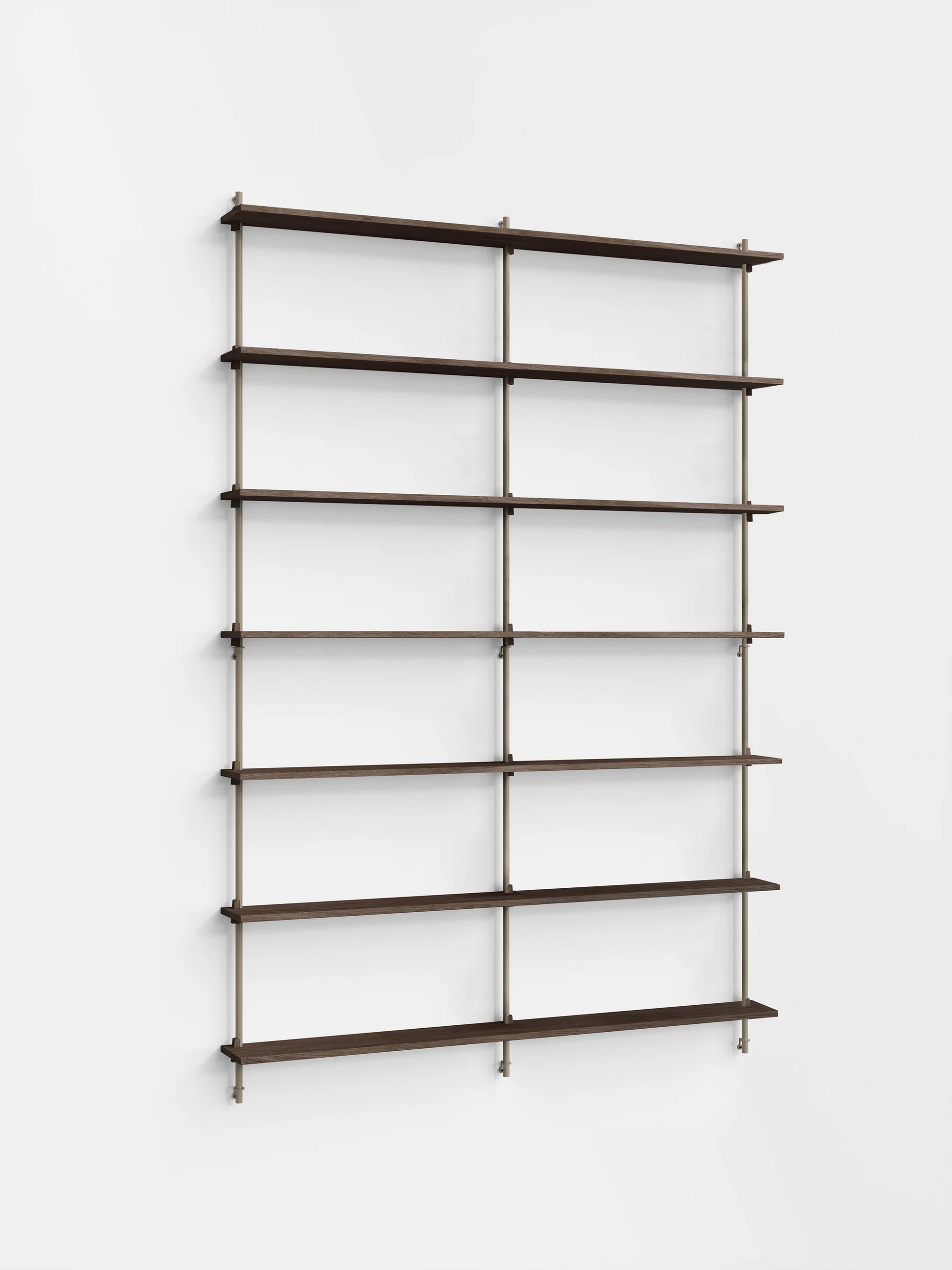 115cmの脚2本をつなぎ合わせた230cmで2列のユニット。162cm幅の棚板7枚の組み合わせです。