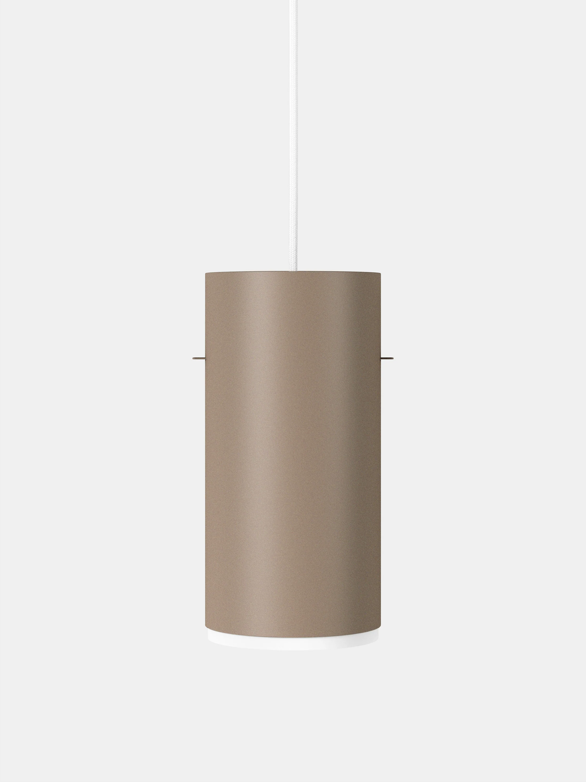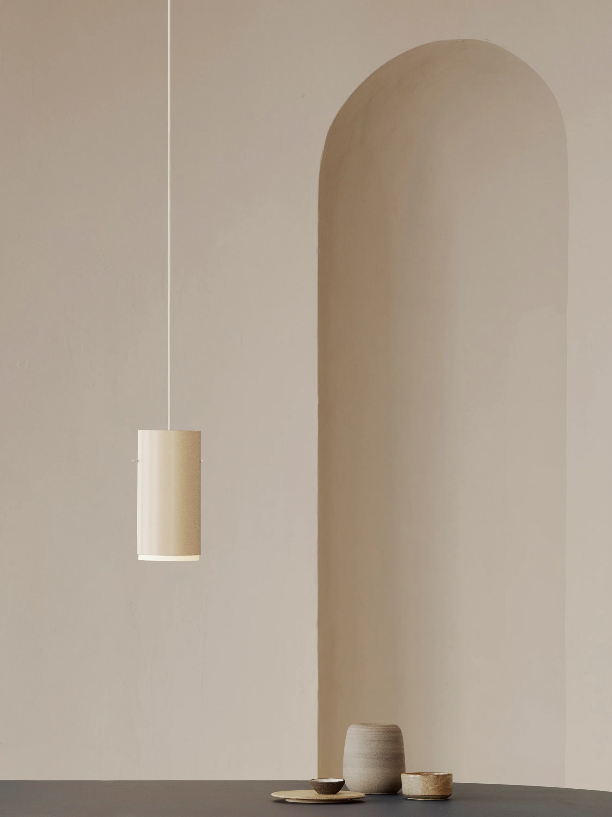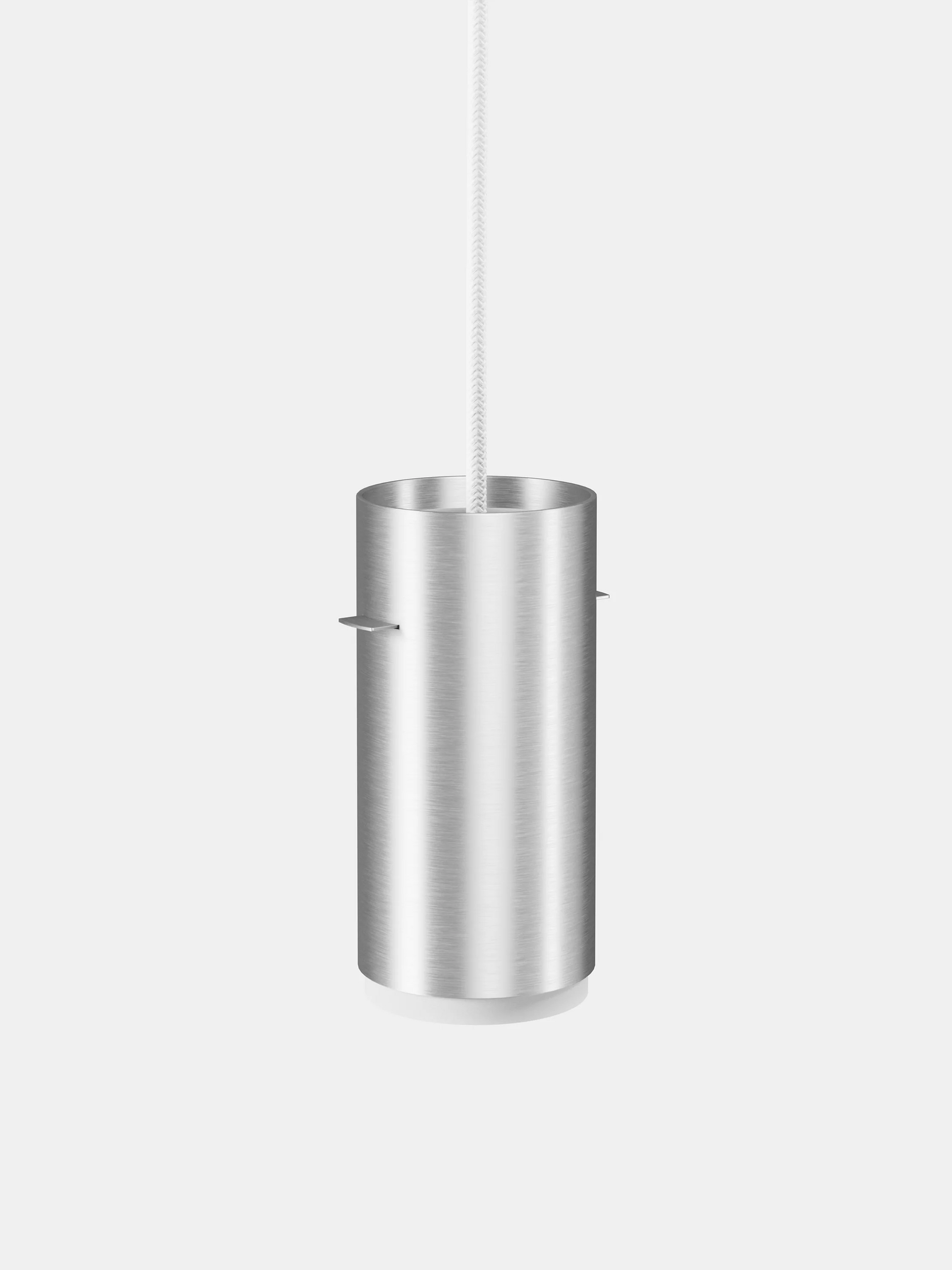 チューブ ペンダントは、アルミニウム チューブでできています。上部のシェードを回転させることで上方への光の拡散を調整でき、内側にセットされた紙シェードをアルミチューブの下端から伸ばすことでランプの端に柔らかく温かみのある光のラインをもたらします。