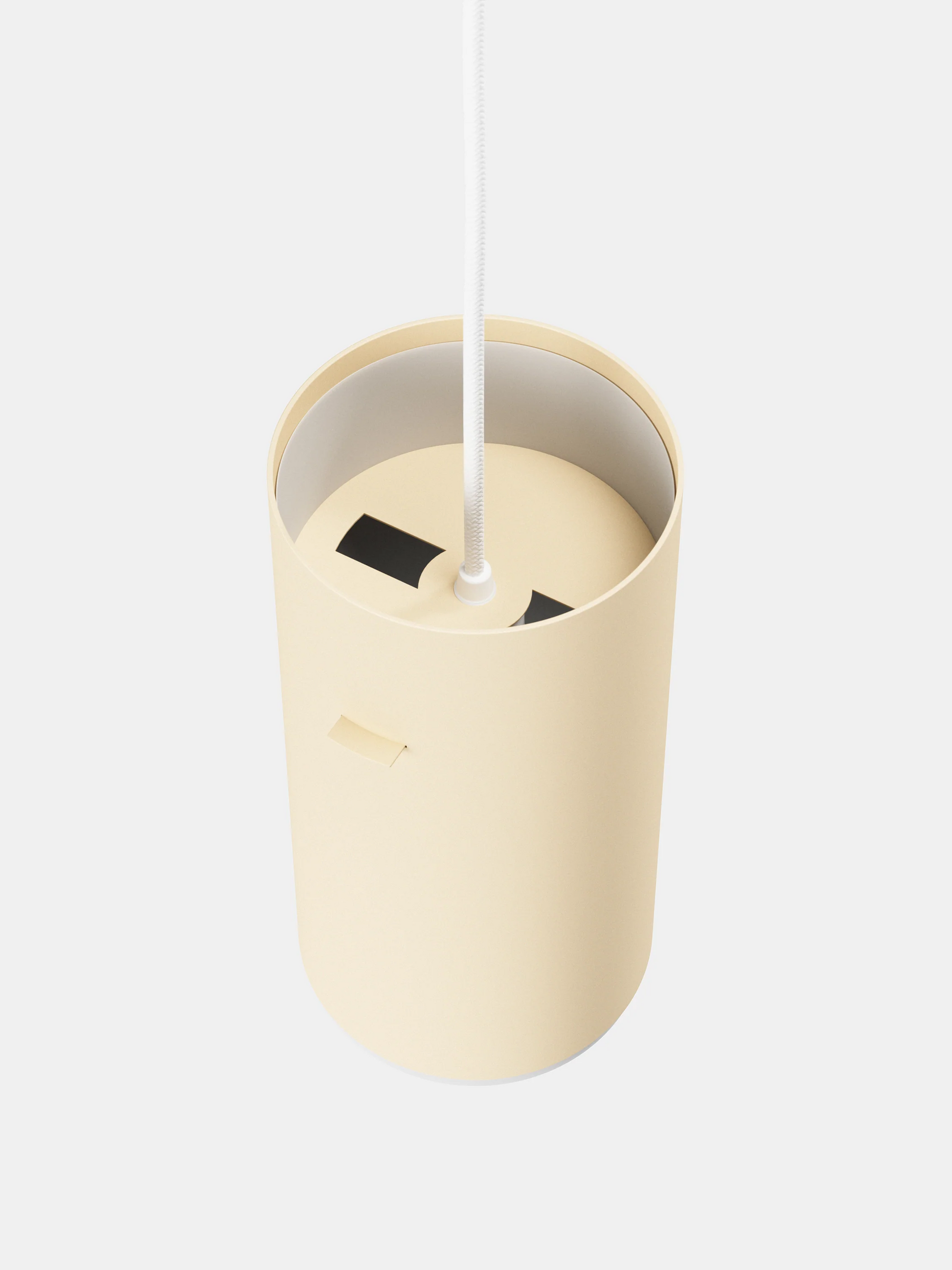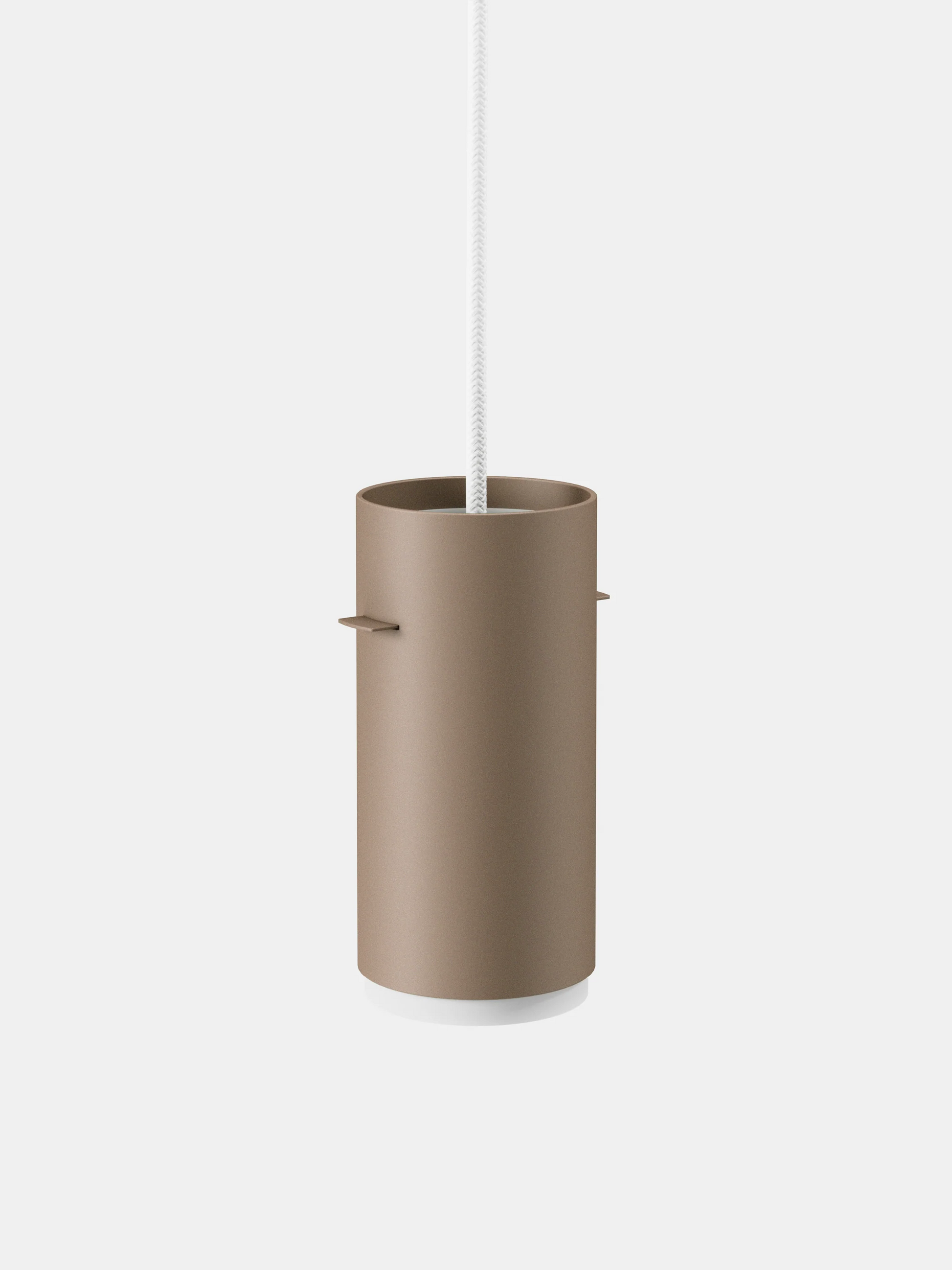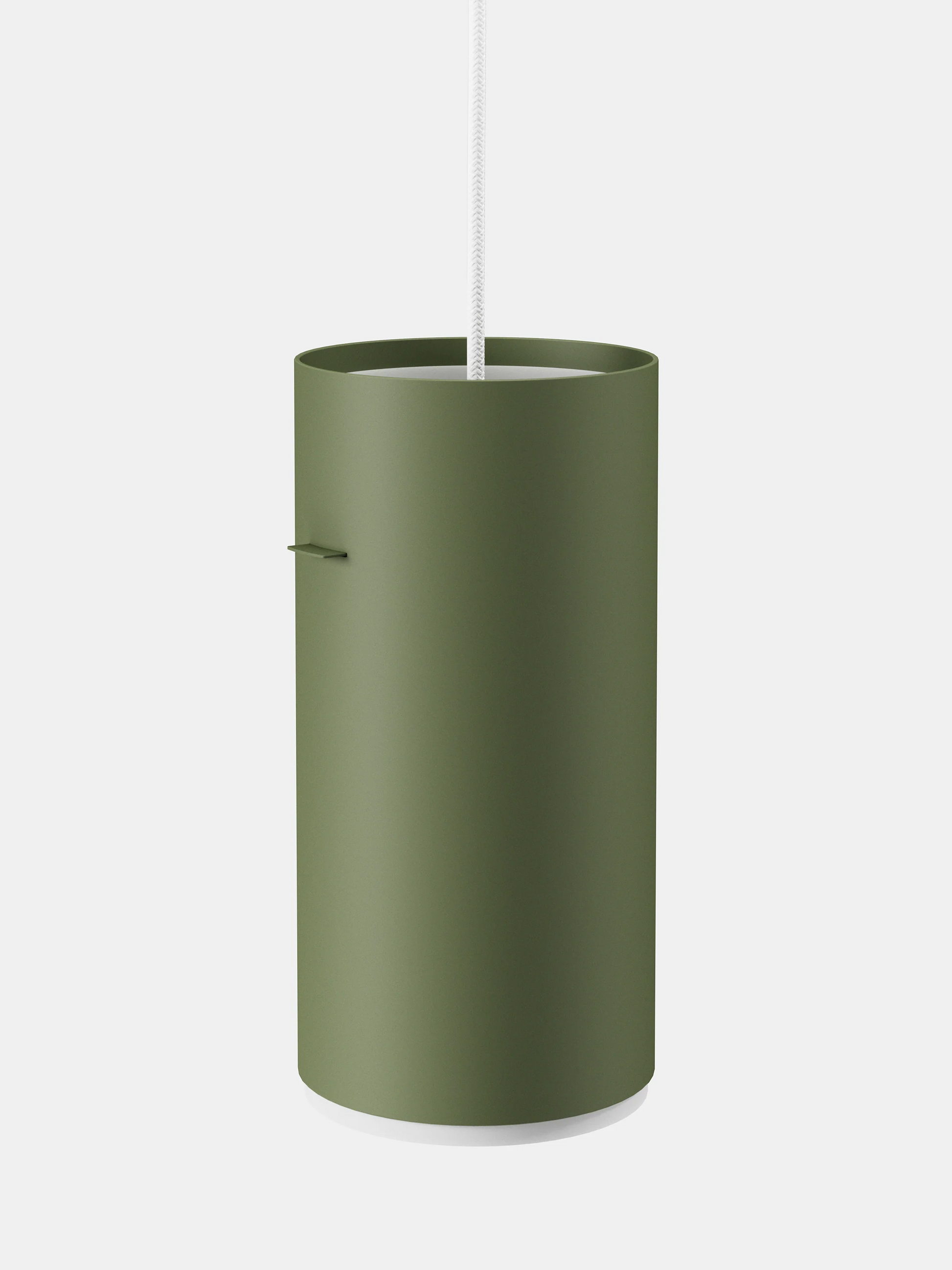 チューブ ペンダントは、アルミニウム チューブでできています。上部のシェードを回転させることで上方への光の拡散を調整でき、内側にセットされた紙シェードをアルミチューブの下端から伸ばすことでランプの端に柔らかく温かみのある光のラインをもたらします。