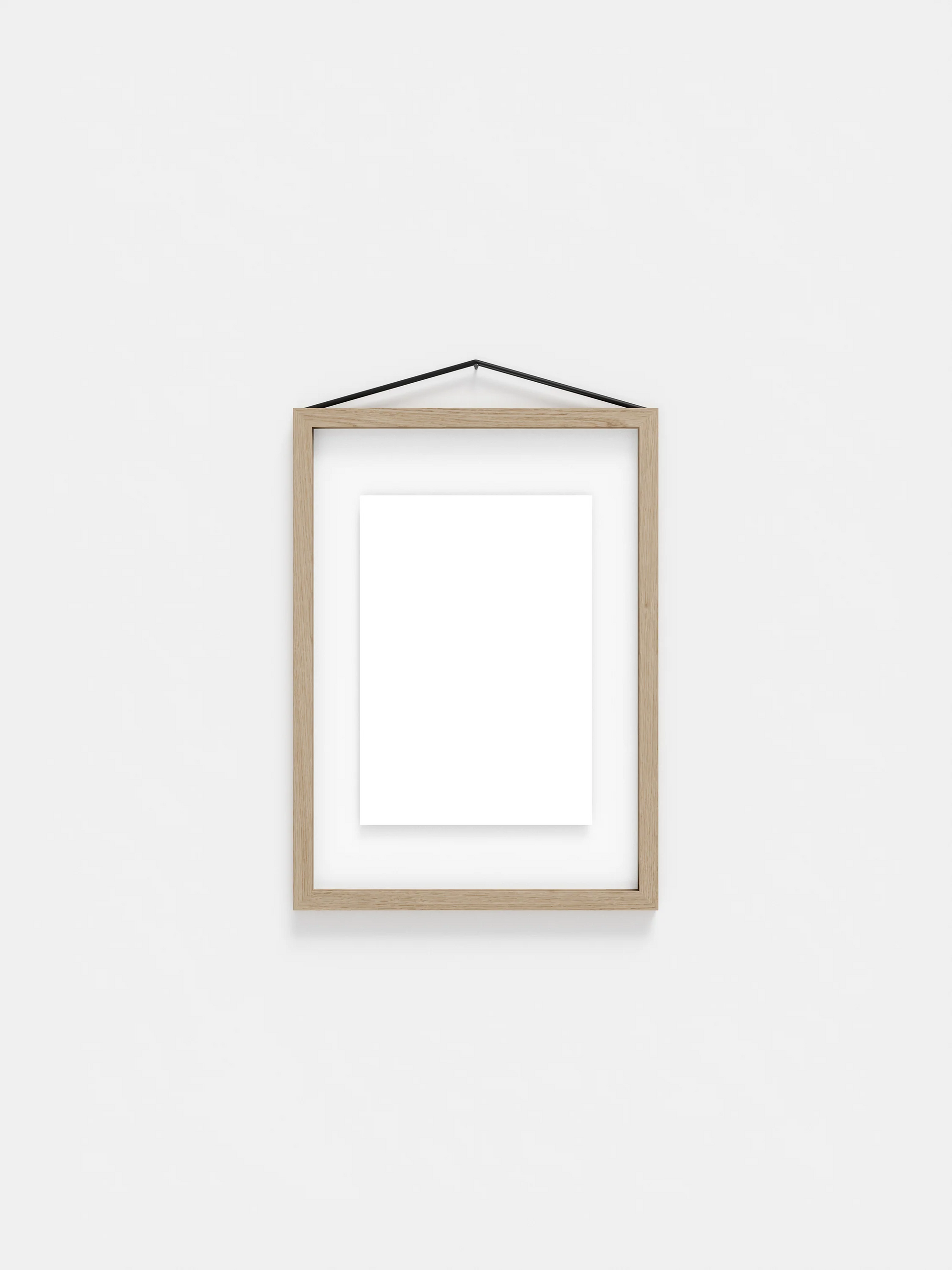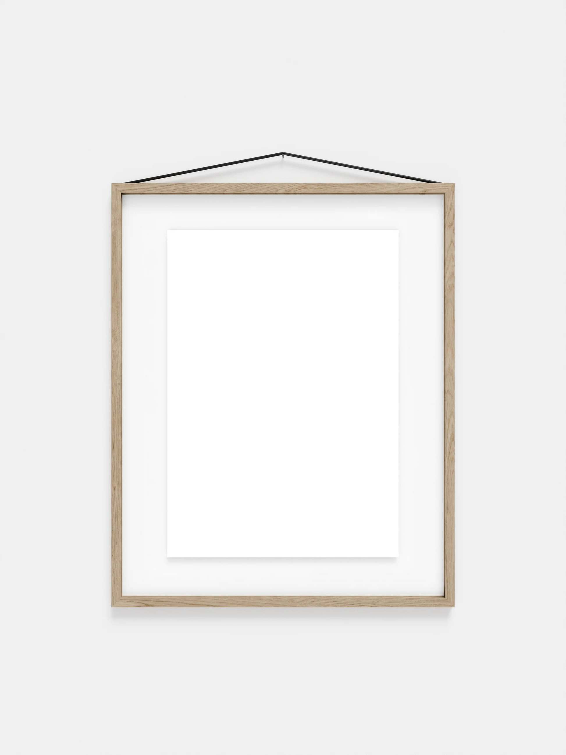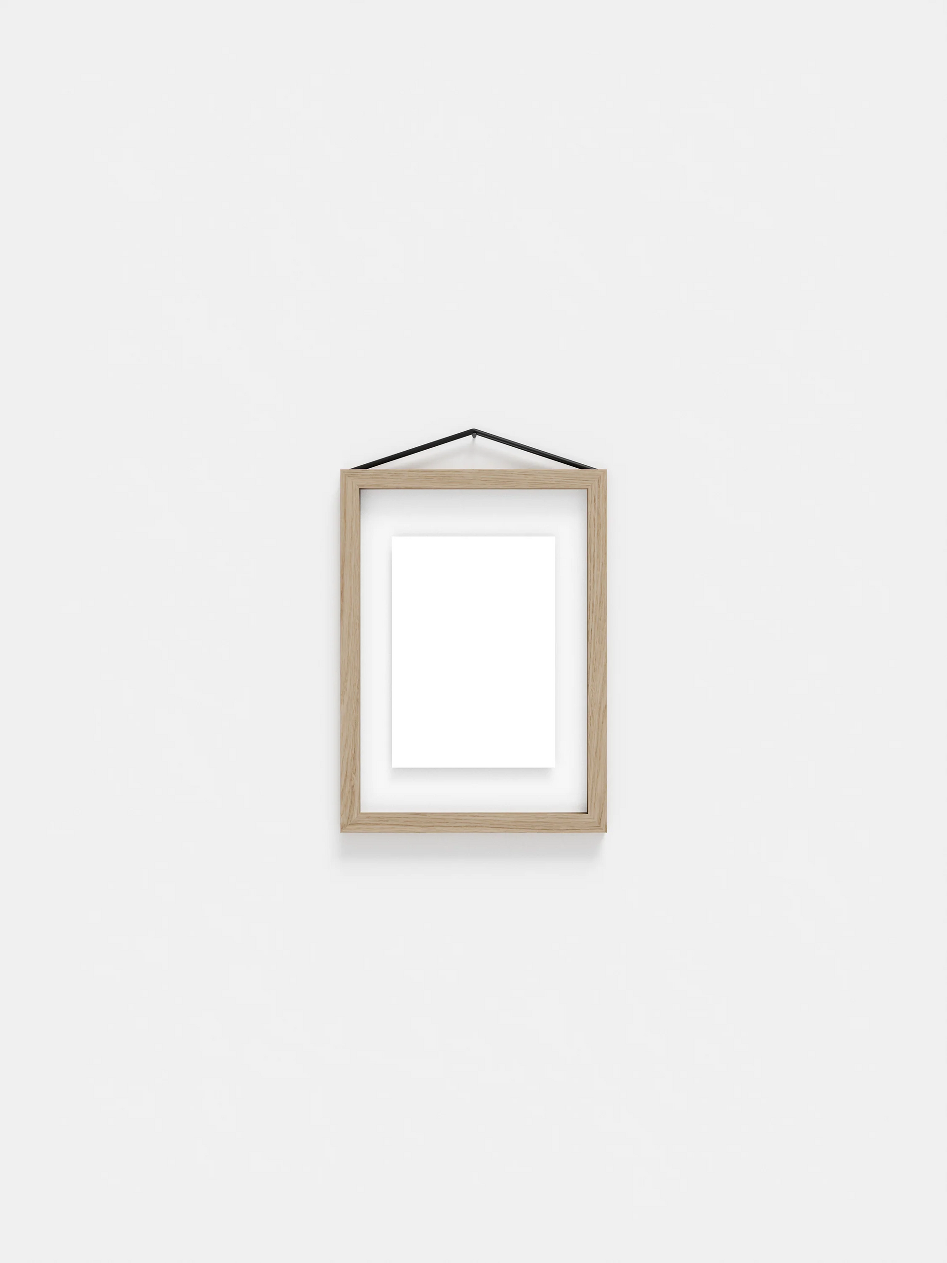 ゴムバンドはフレームをまとめるだけでなく、壁にフレームを掛ける役割も果たします。シンプルですが非常に考え抜かれた構造で、フレームは縦横どちらの向きでも掛けることができ、表裏の区別がないため、平面的な見せ方だけではなく、両側から見せる飾り方も可能になります。 8種類の仕上げと 6種類のサイズ (40x50 cm と 50x70 cm はオークとブラックのみ) からお選びいただけます。