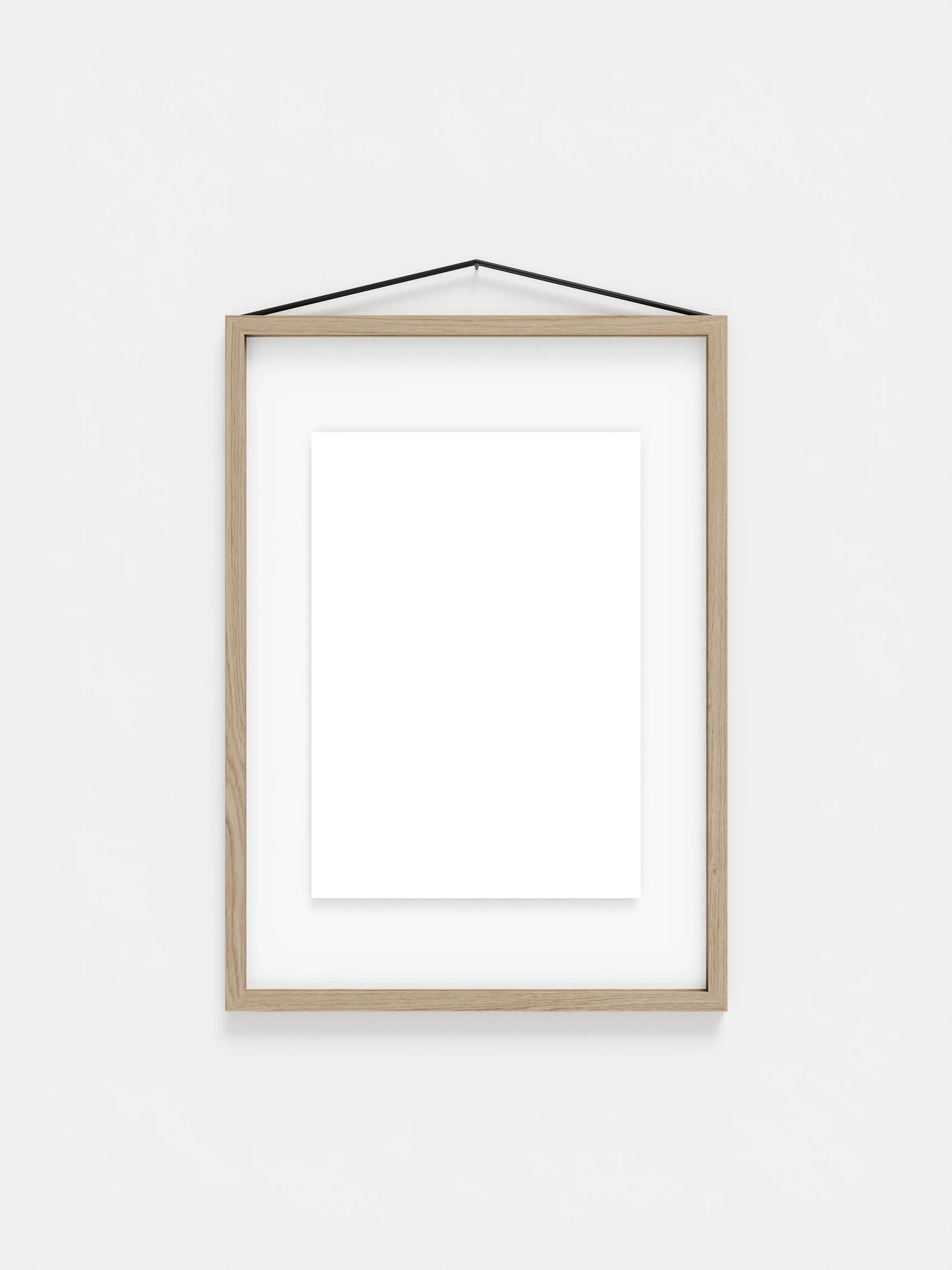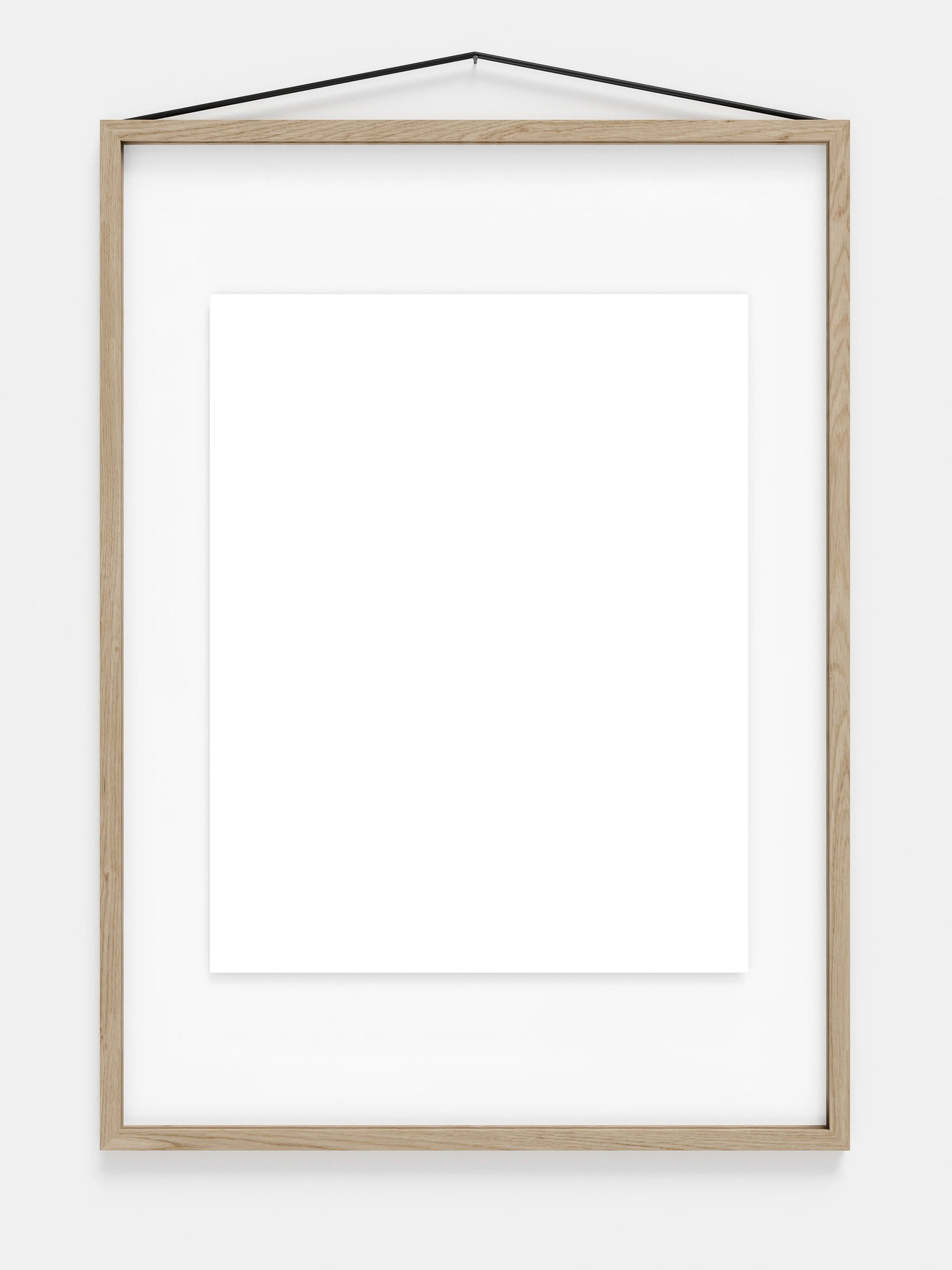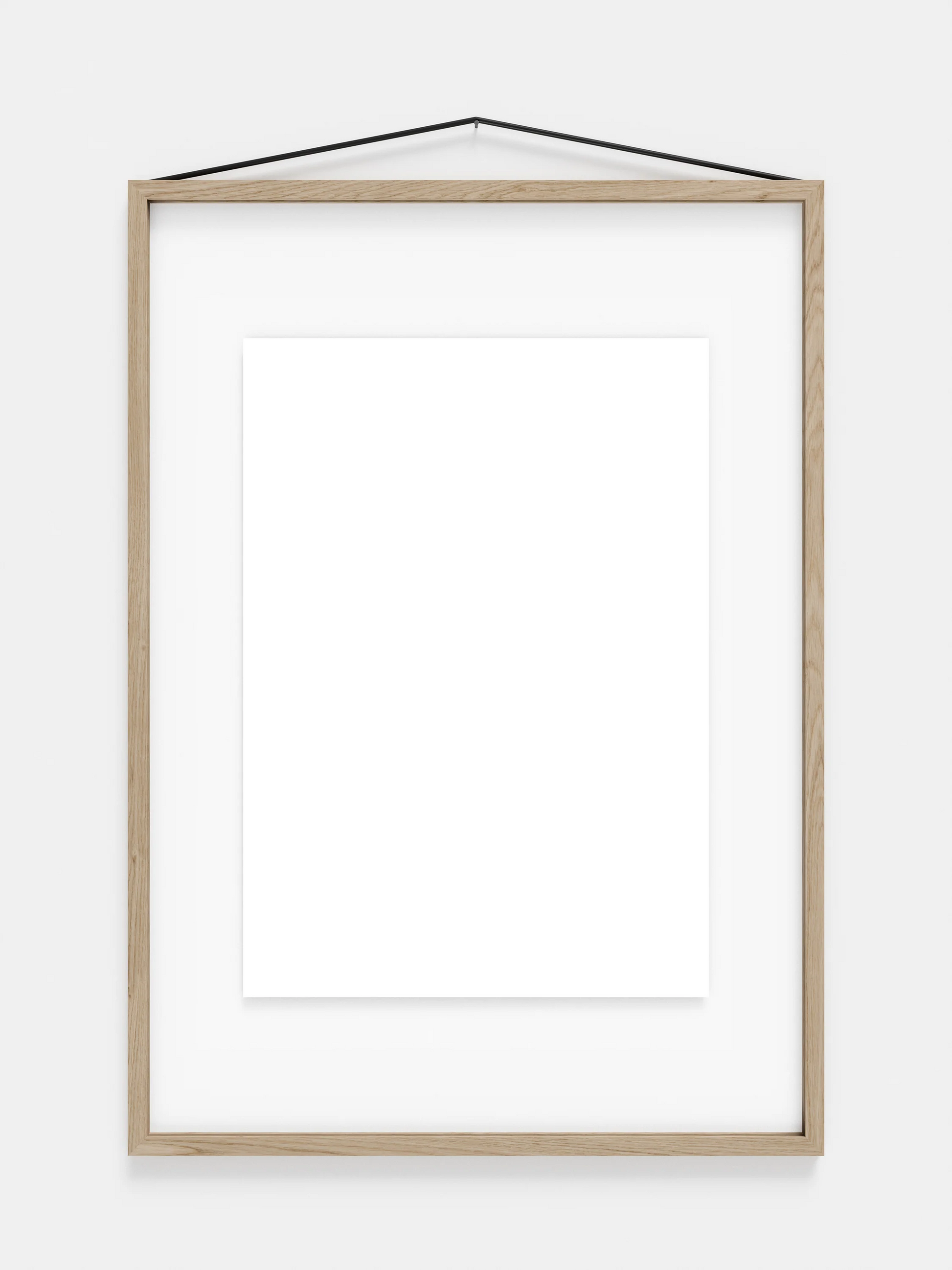 ゴムバンドはフレームをまとめるだけでなく、壁にフレームを掛ける役割も果たします。シンプルですが非常に考え抜かれた構造で、フレームは縦横どちらの向きでも掛けることができ、表裏の区別がないため、平面的な見せ方だけではなく、両側から見せる飾り方も可能になります。 8種類の仕上げと 6種類のサイズ (40x50 cm と 50x70 cm はオークとブラックのみ) からお選びいただけます。