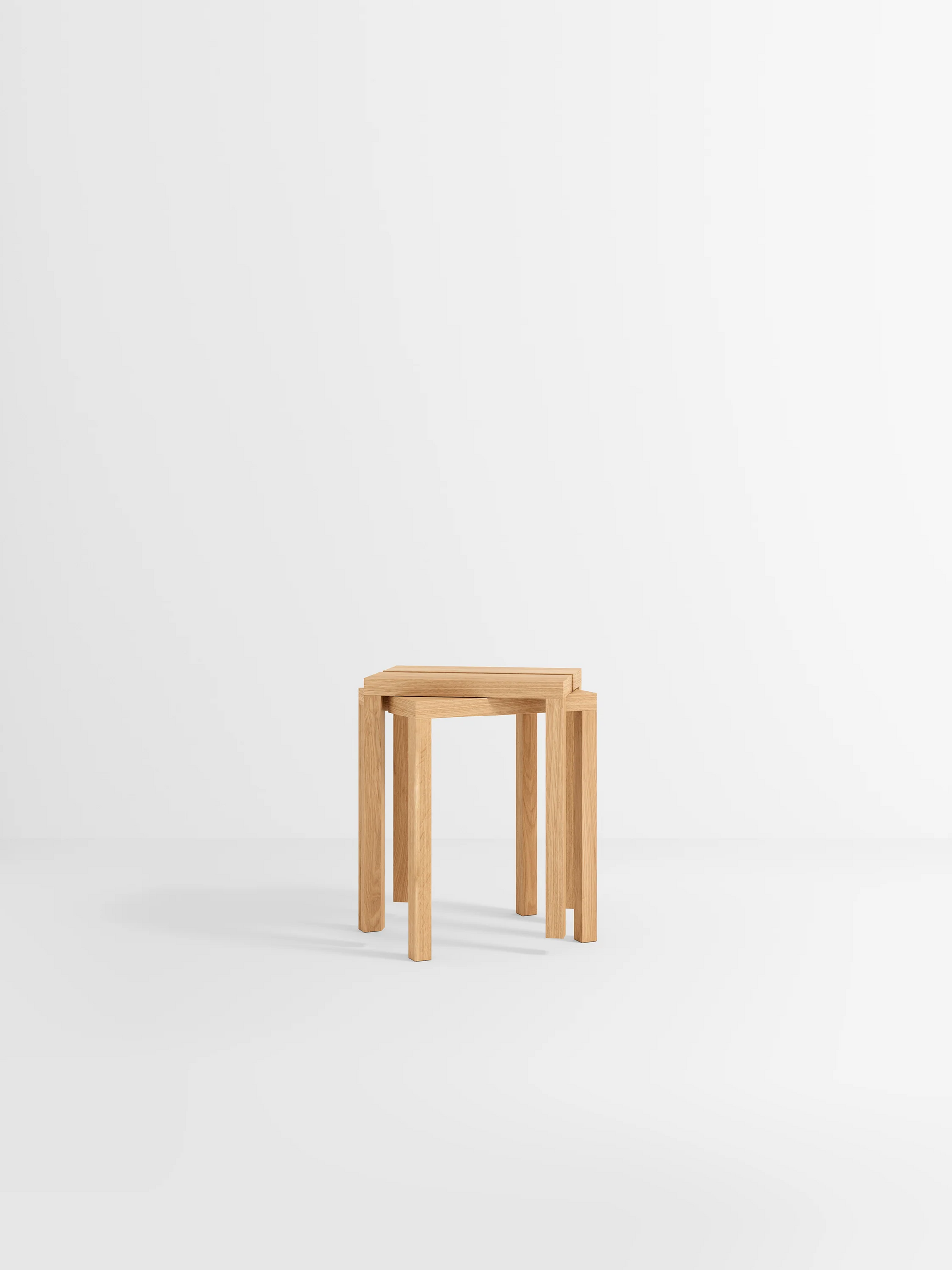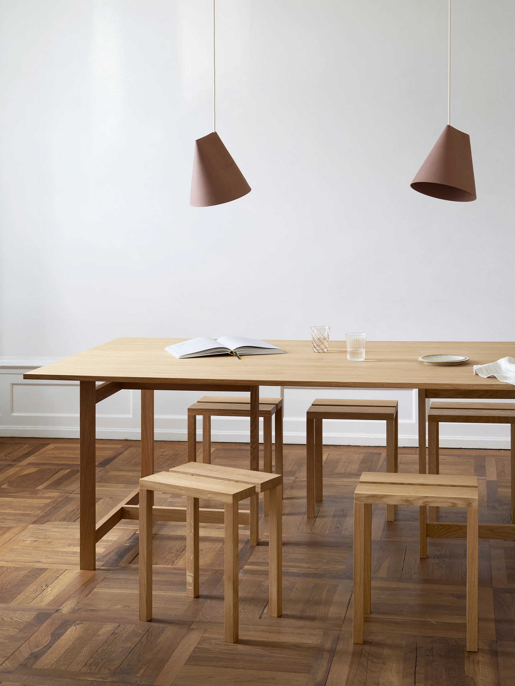 ペグスツールは、木製のペグで結合された2つの部分から形成されています。スツールをつなぎ合わせるだけでなく、中央に便利な溝を作ることで、スツールを片手で簡単に移動させることができます。また、3つまで積み重ねることができるので、スッキリと整理整頓できます。