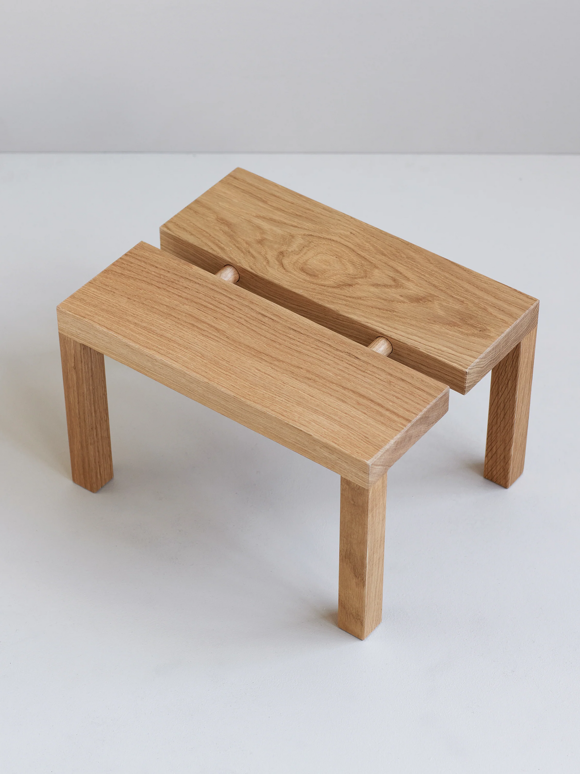 ペグステップスツールは、木製のペグで結合された2つの部分から形成されています。スツールをつなぎ合わせるだけでなく、中央に便利な溝を作ることで、スツールを片手で簡単に動かすことができます。また、3つまで積み重ねることができるので、整理整頓された空間を保つことができます。