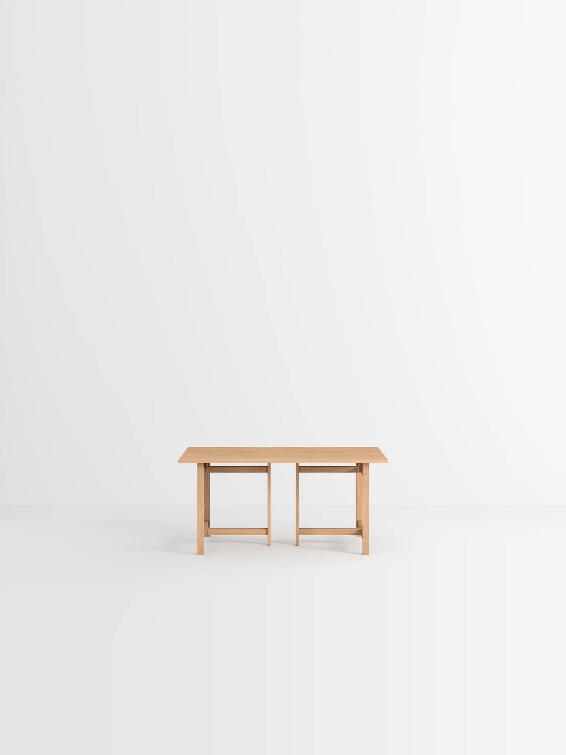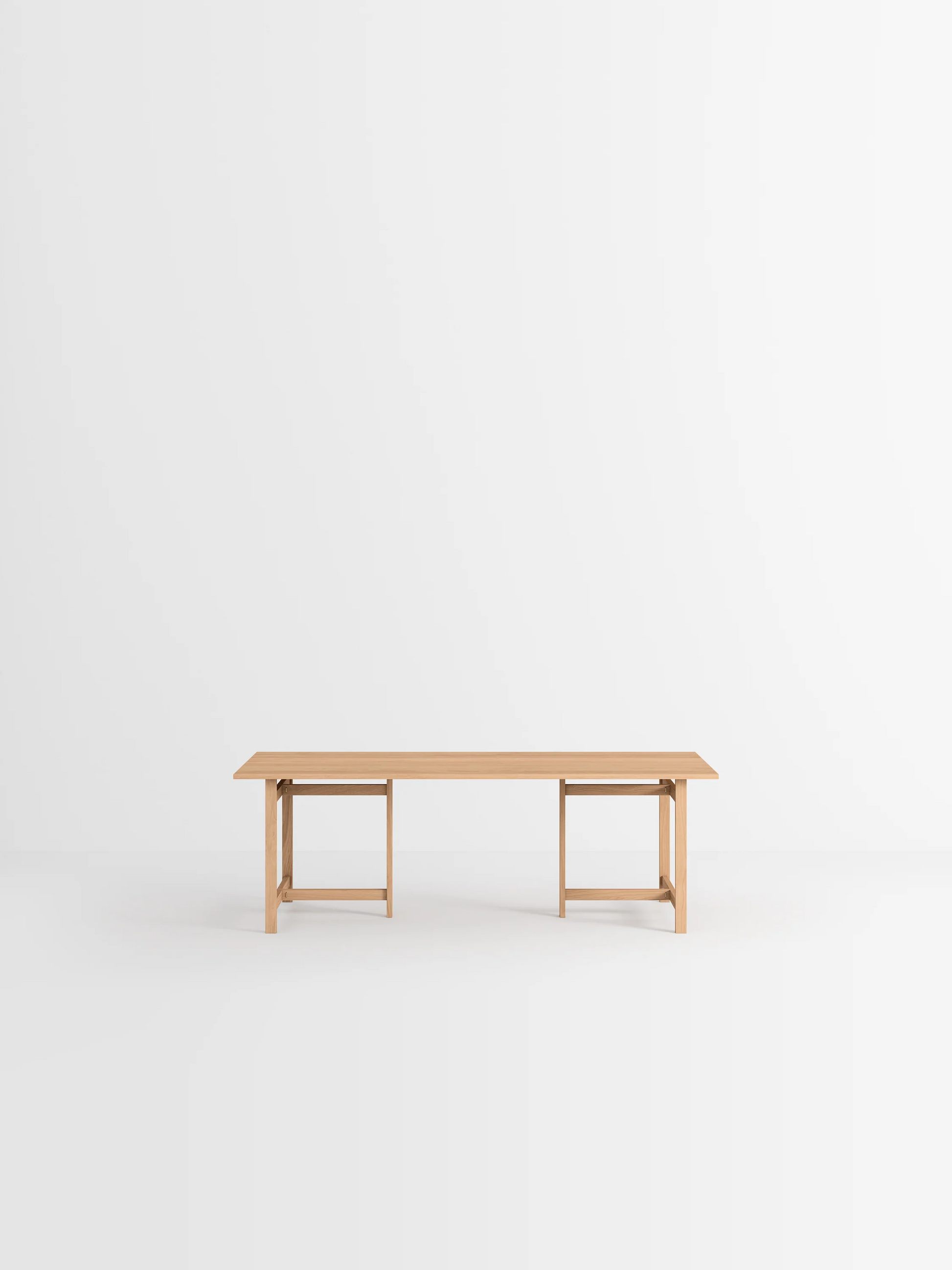 MOEBEのダイニングテーブルは、シンプルな形状と構造が特徴です。フラットパックで届いたら、2つの脚をT型に組み立て、天板を上に固定します。