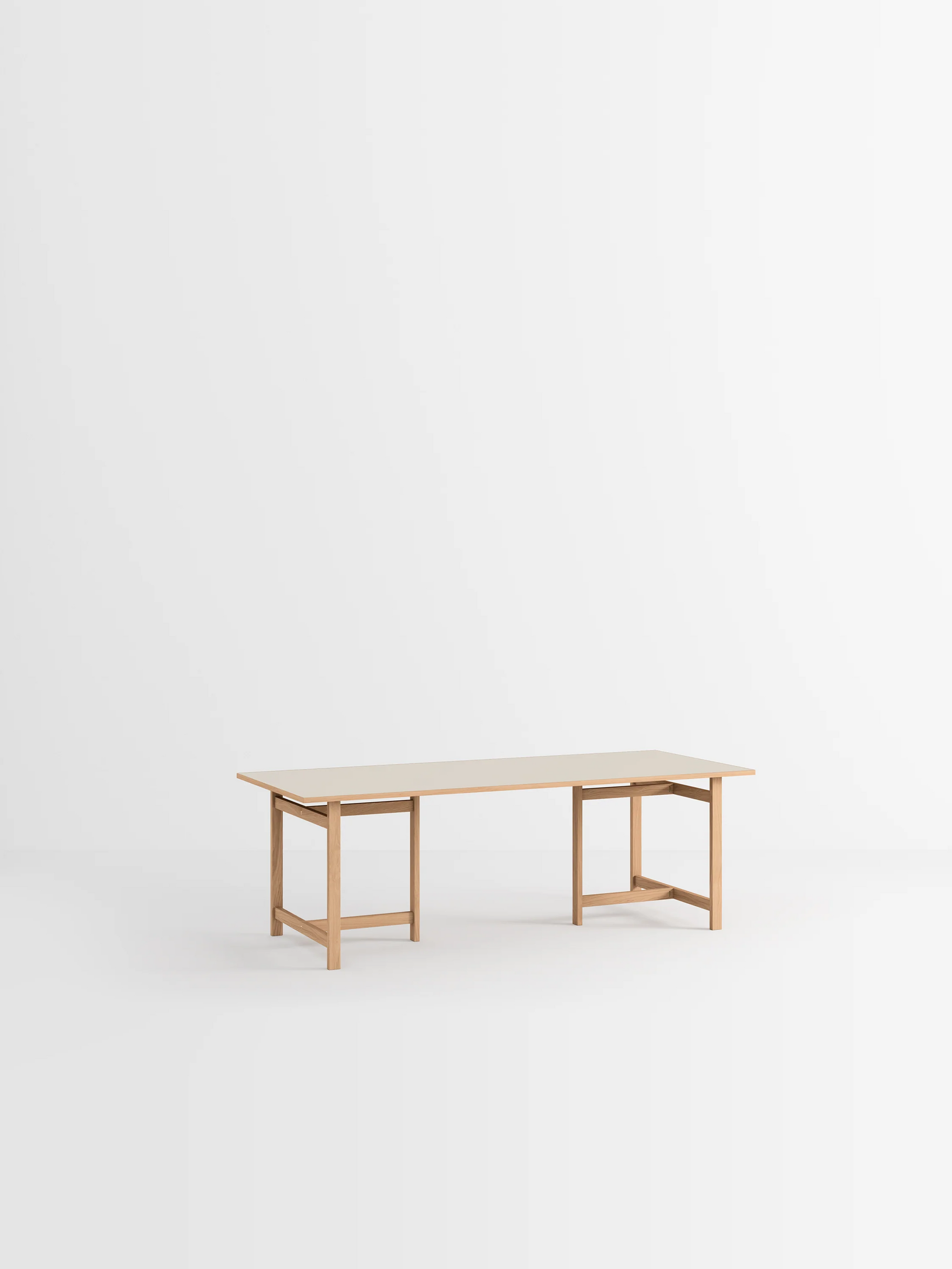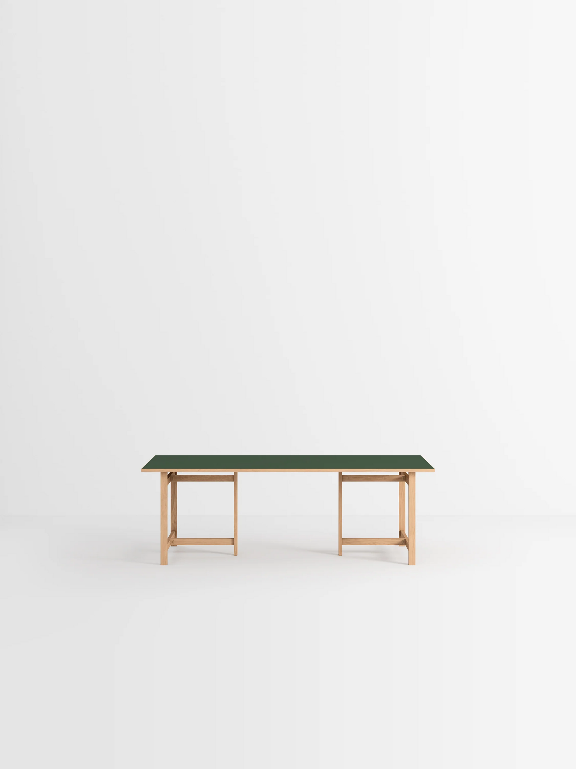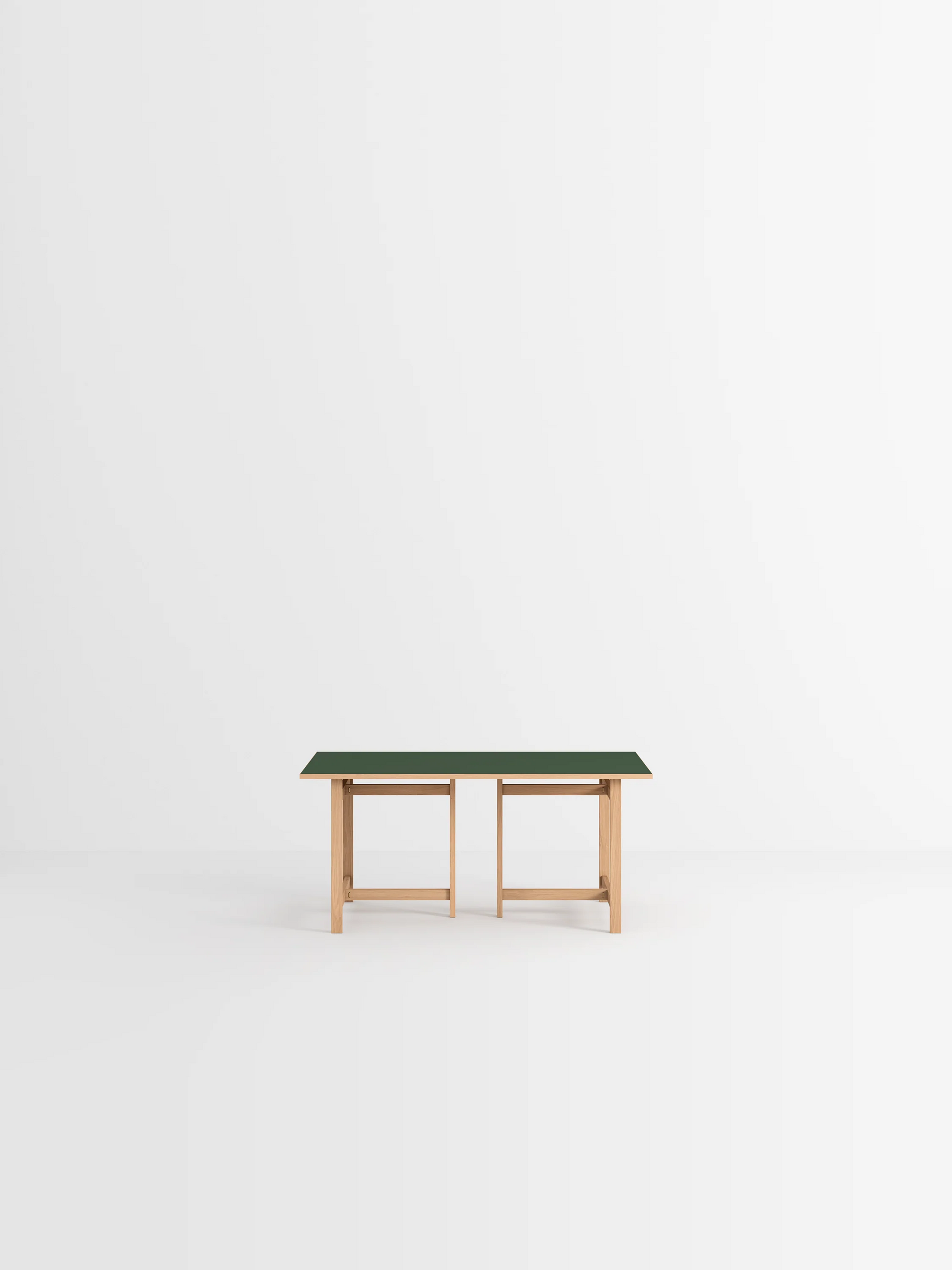 このテーブルは2つの長さと4つの天板の仕上げから選べます。天板の素材は、オークまたはカラーリノリウムです。