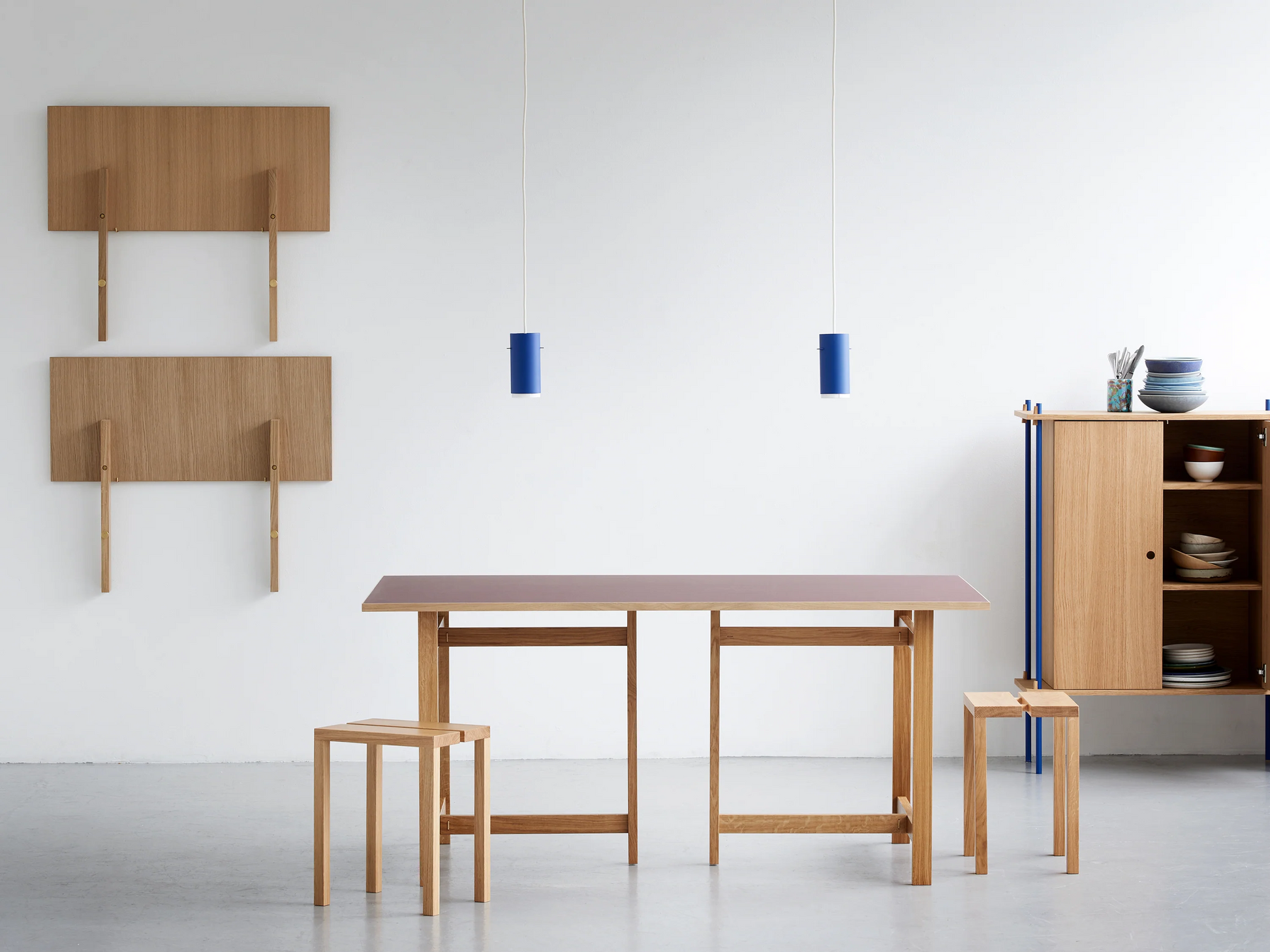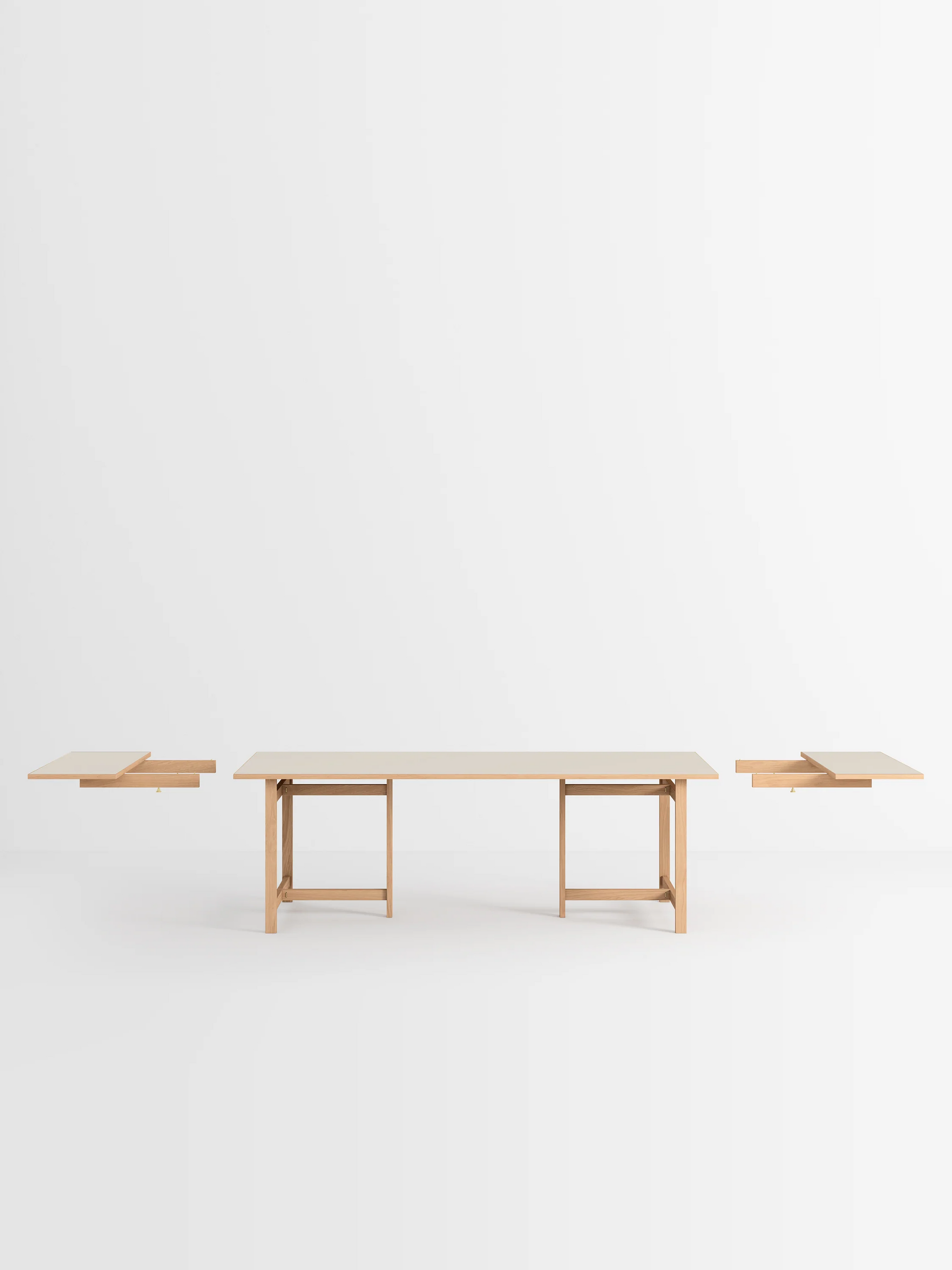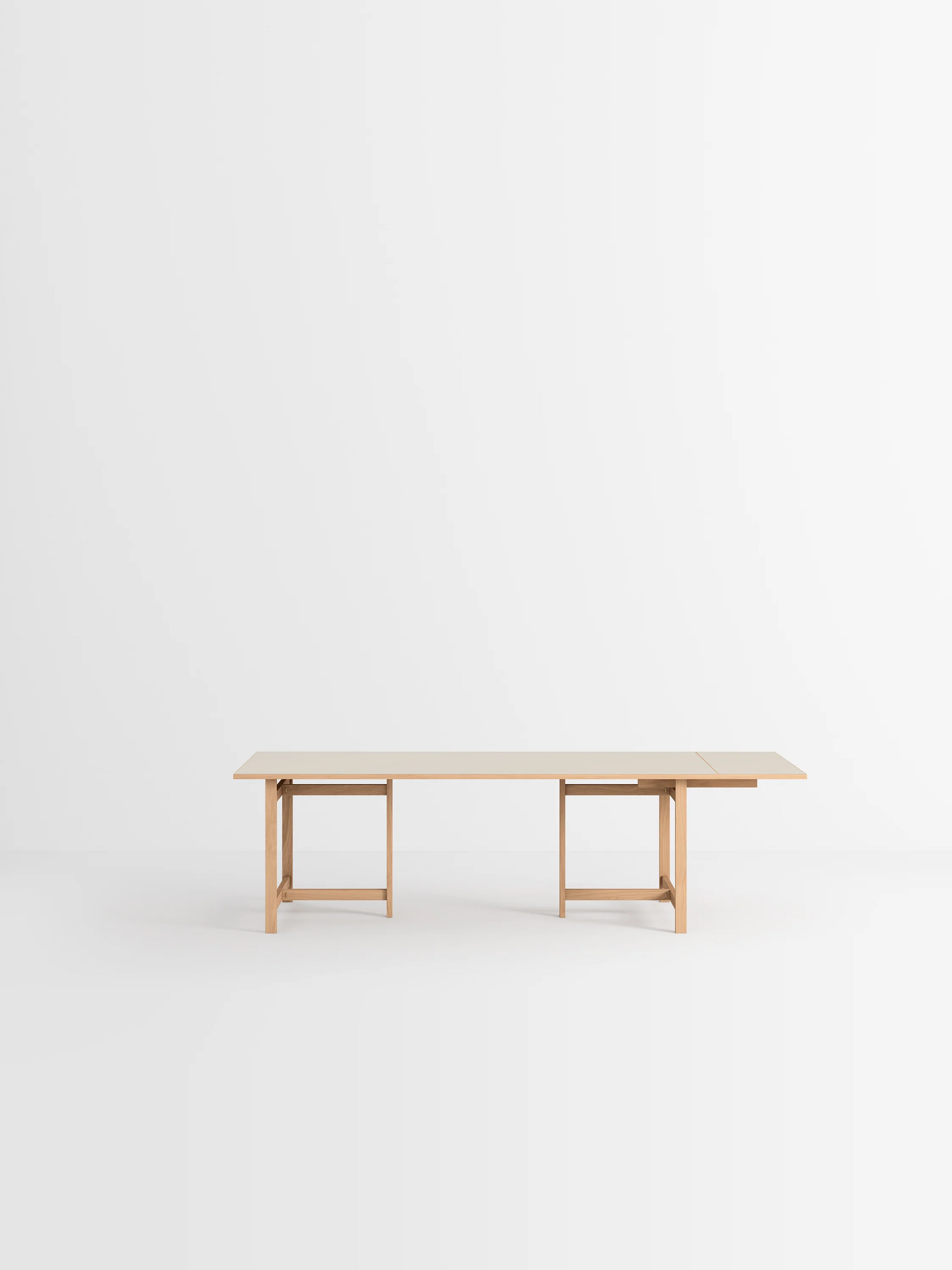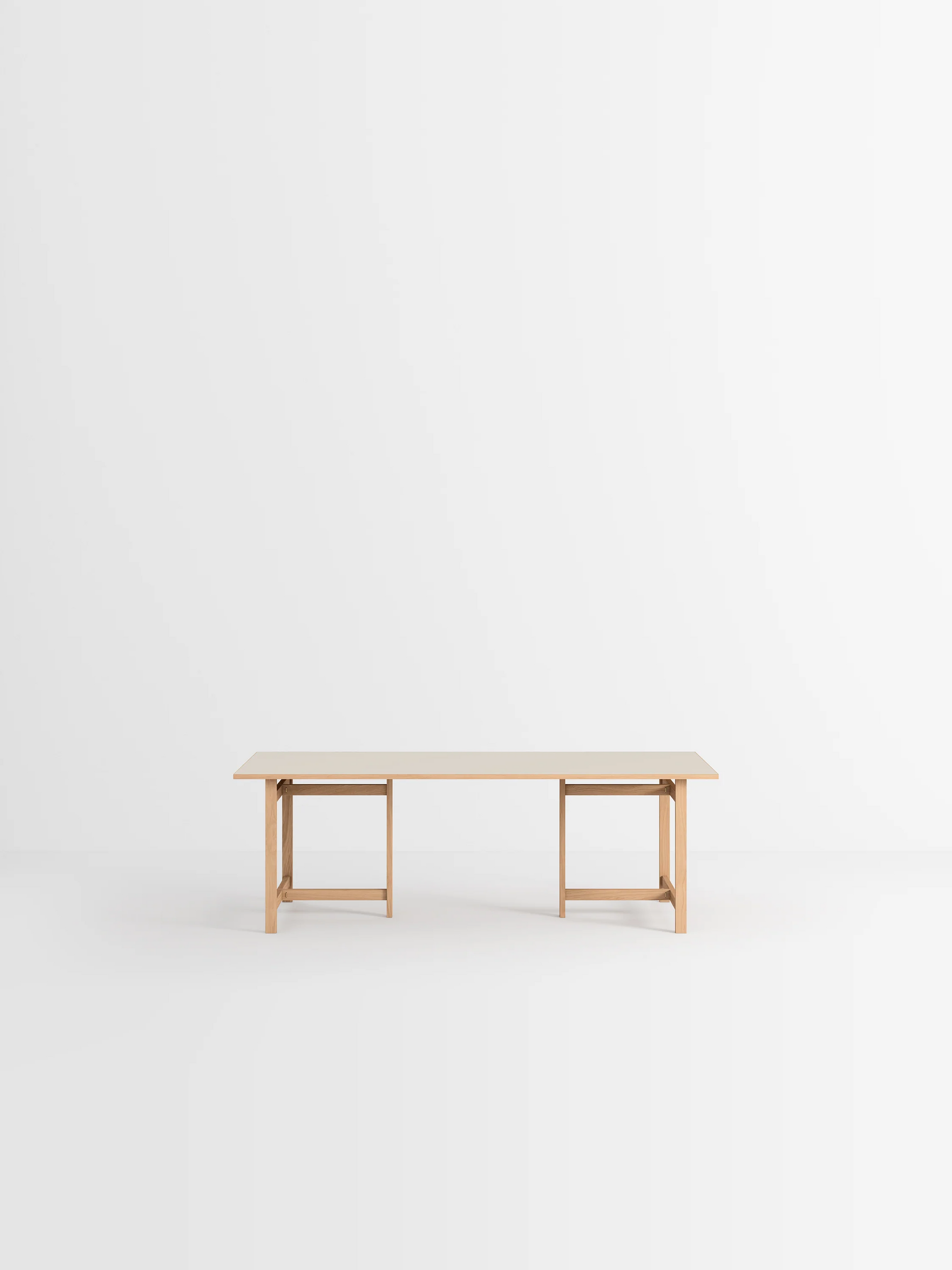 このテーブルは2つの長さと4つの天板の仕上げから選べます。天板の素材は、オークまたはカラーリノリウムです。