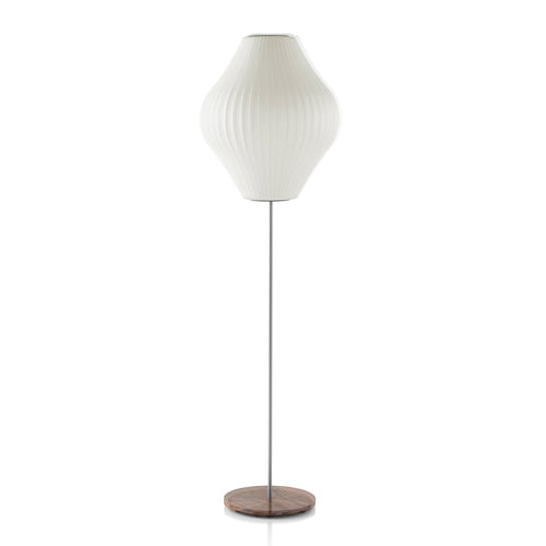 ネルソンバブルンプシリーズのひとつペアロータスランプは、細長い球体のフォルムにすっきりとした平行線がアクセントを加えています。スチール製のベースに取り付けられたランプが、柔らかな明かりを放ちます。バブルランプは、ジョージ・ネルソンがシルクで覆われたスウェーデン製のペンダントランプから着想を得て、1952年にデザインしたものです。