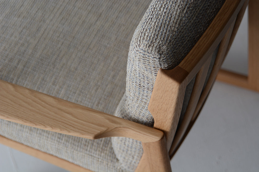 背クッションは、羽毛とウレタンを混合し充填することで、羽毛ならではの静かに沈みこむ感覚と、ウレタンのコシのある反発力を兼ね備え、型崩れしにくい構造です。