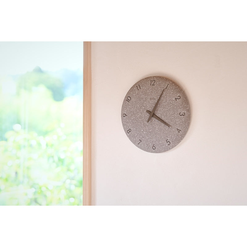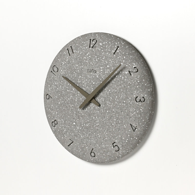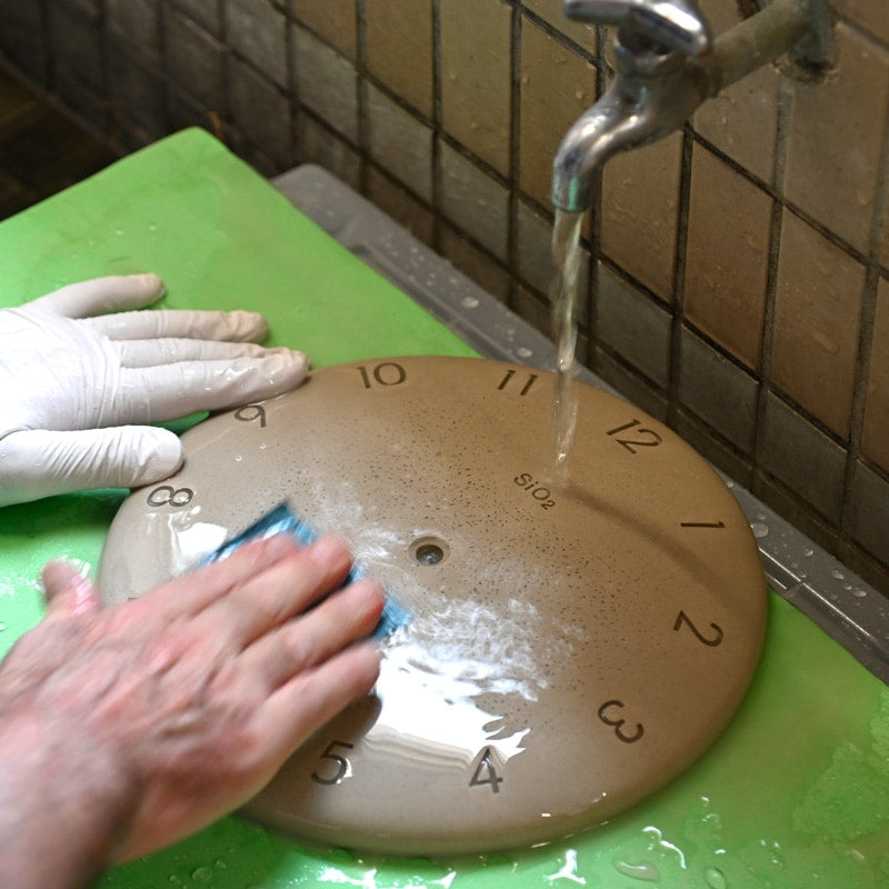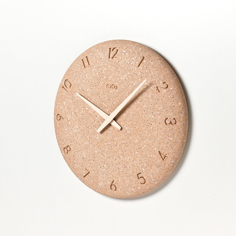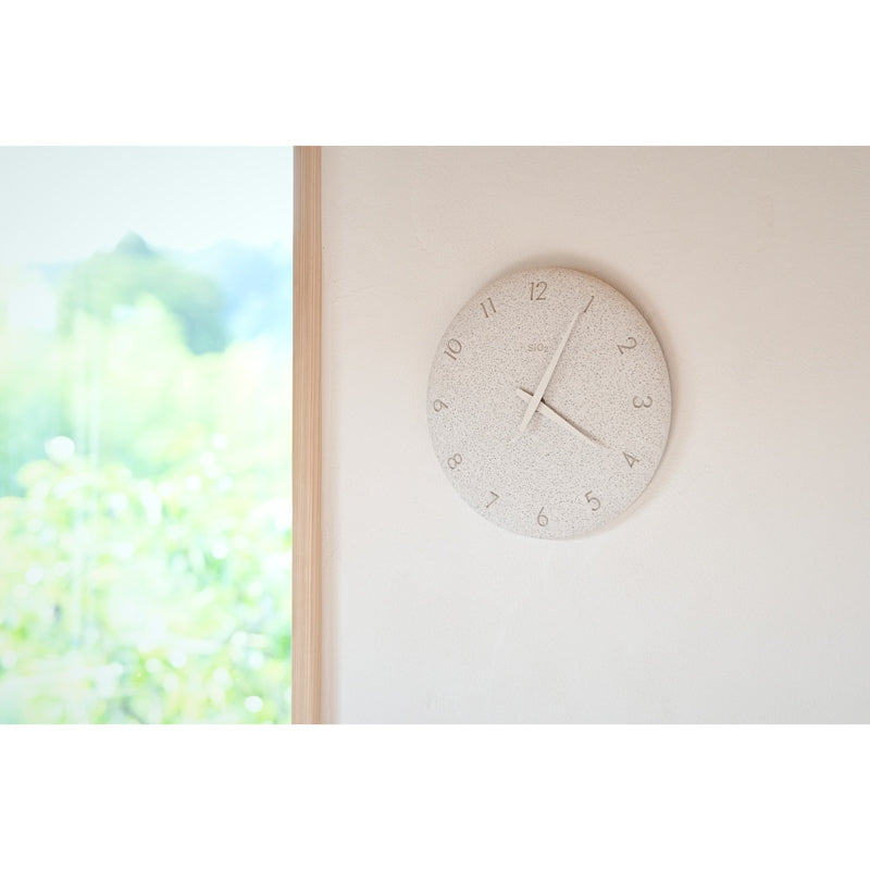 珪藻土の時計第3弾、建物の壁を仕上げる左官職の技法の一つ「洗い出し仕上げ」を用いて製作した時計です。