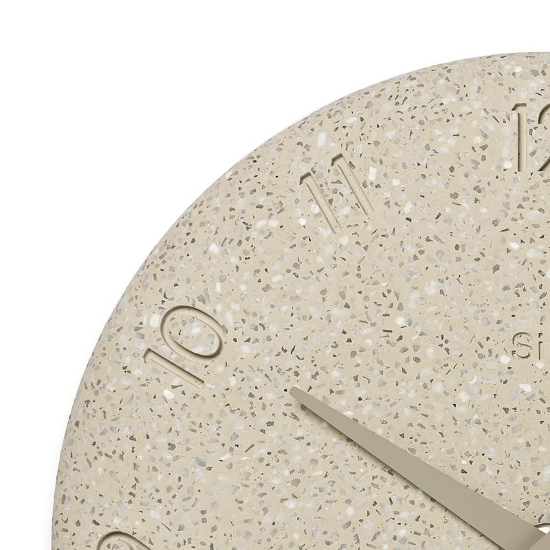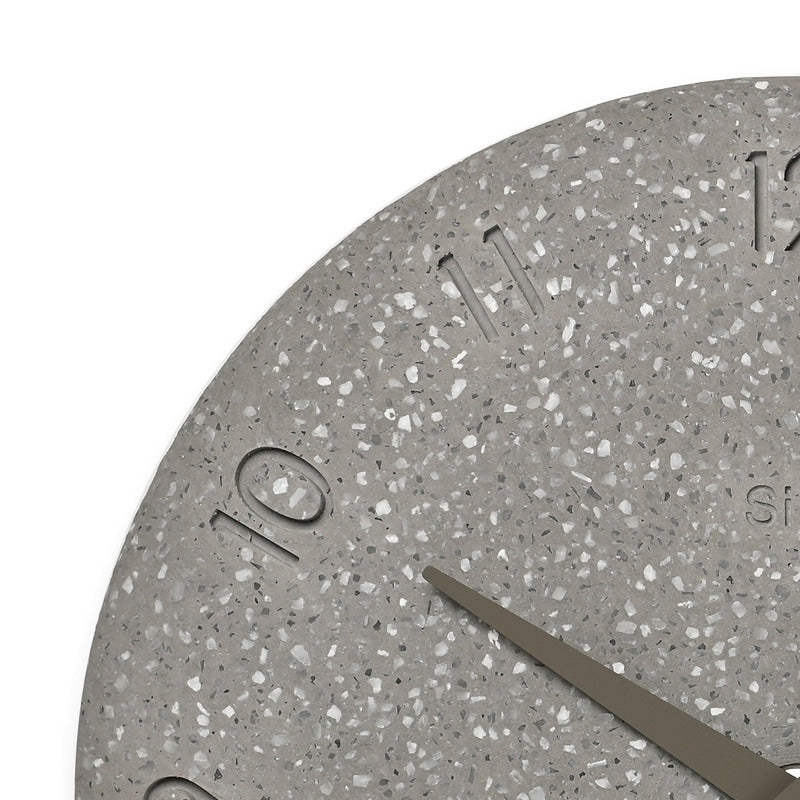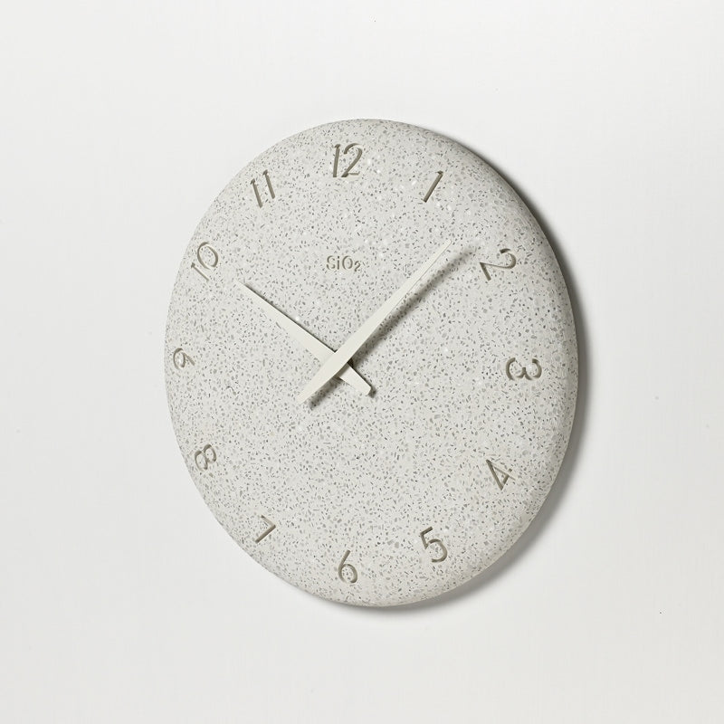 緩やかにカーブする時計の形状は表面に光と影のグラデーションを作り、無数の石の表情を強調します。彫り込まれた時計の数字のエッジを崩すことなく、石の表面を綺麗に洗い出すのはコツがいる作業で、soilの職人の繊細な手作業によって実現することができました。