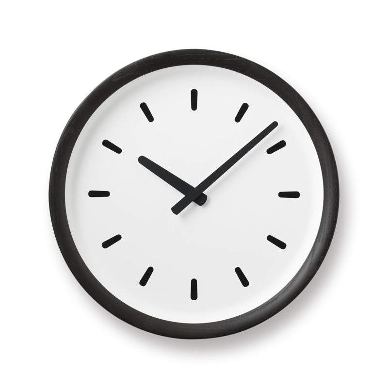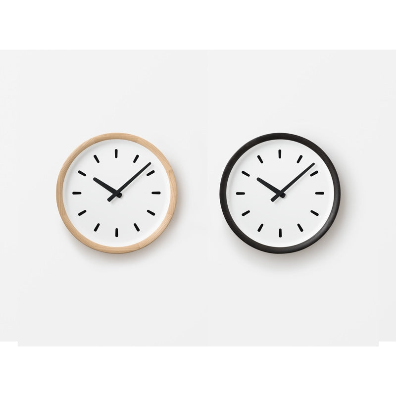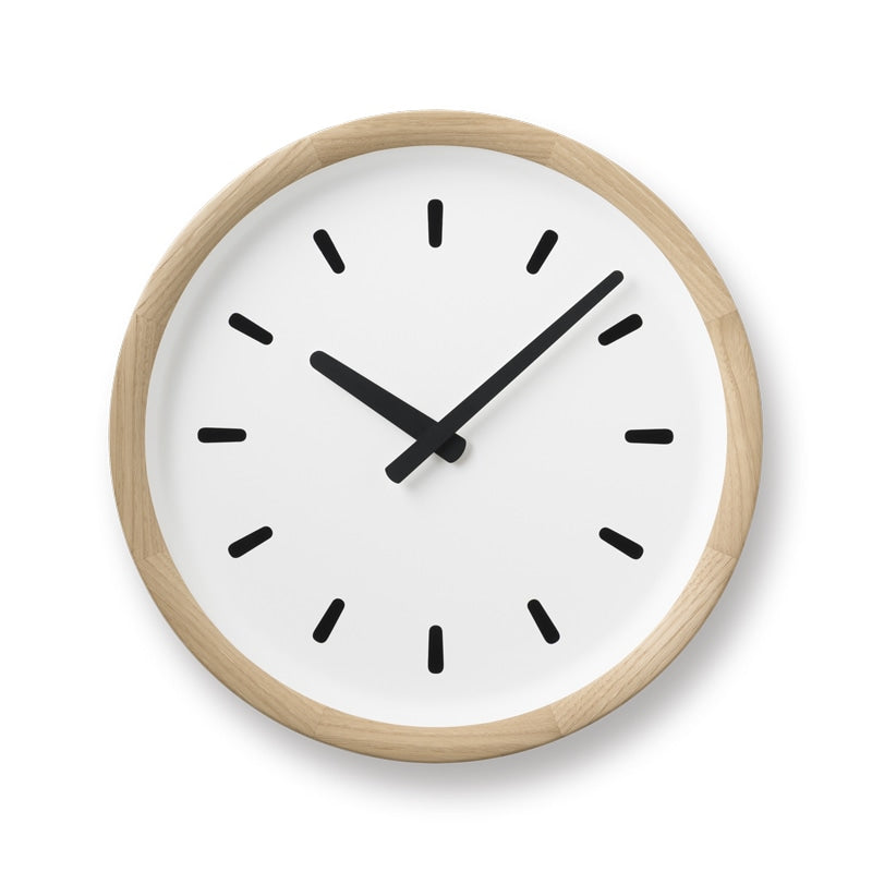 器の形から着想を得てデザインした壁掛け時計です。木枠に向けてなだらかに立ち上がる文字盤は余白が広く、斜めから見た際も木枠が針や指標を遮らず時計の見やすさを高めてくれています。器のような一体感のある形状は、針や指標を引き立てながら周囲の光を受けやわらかい陰影を作り出します。