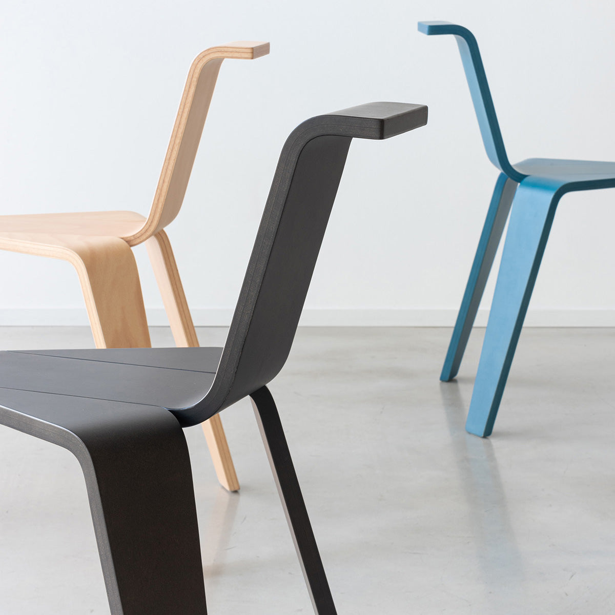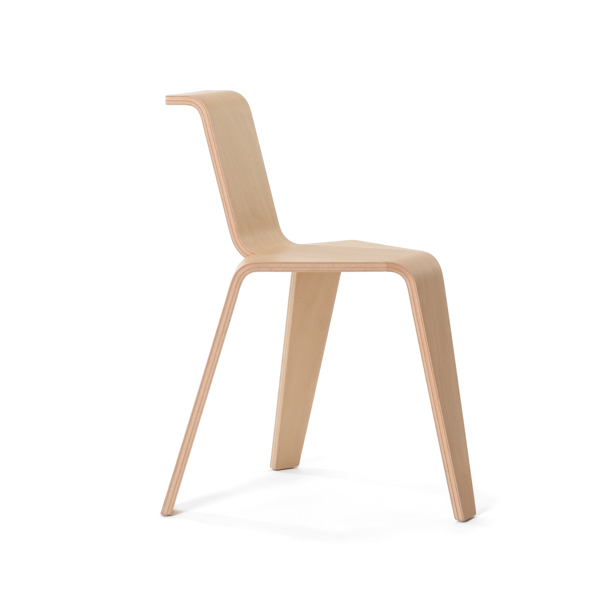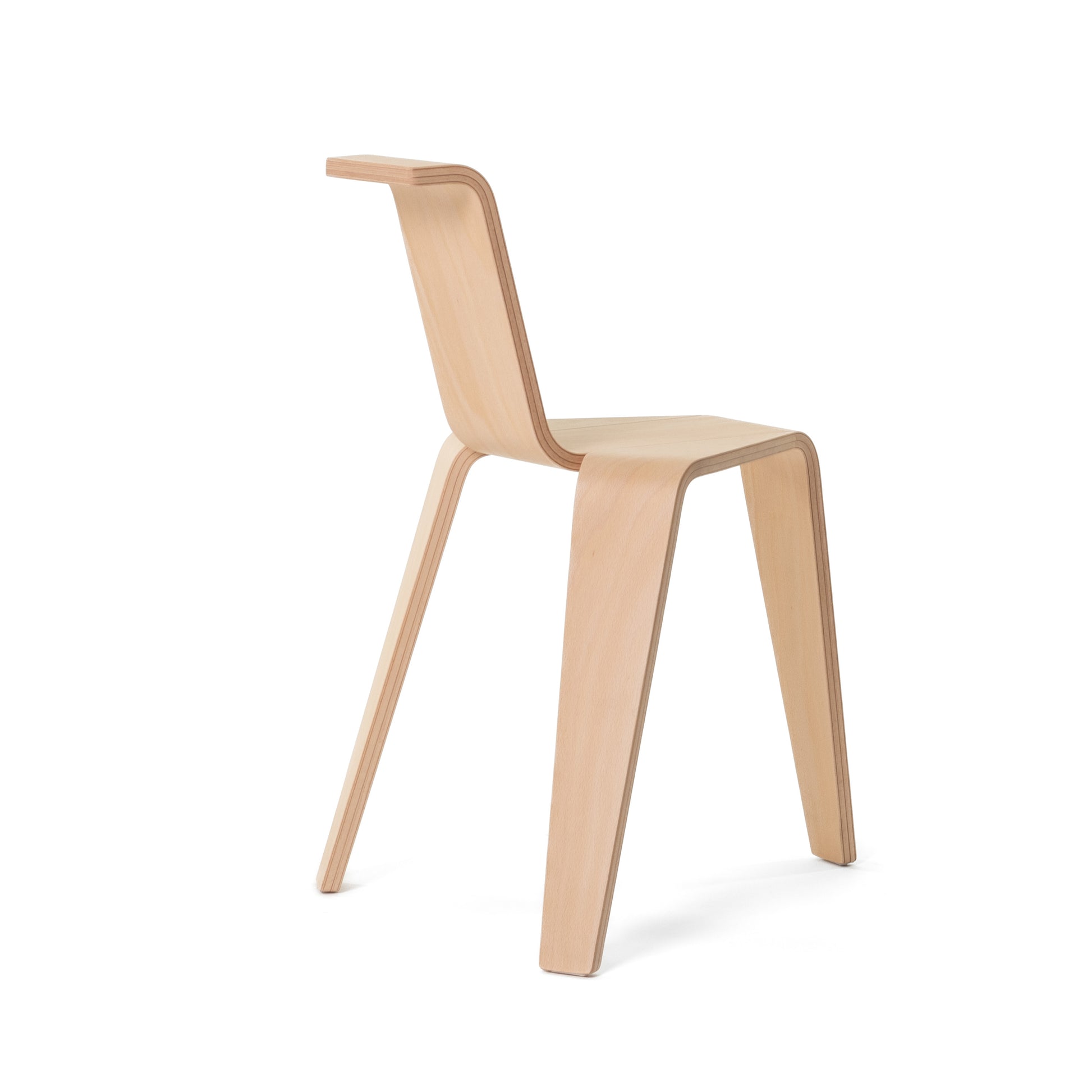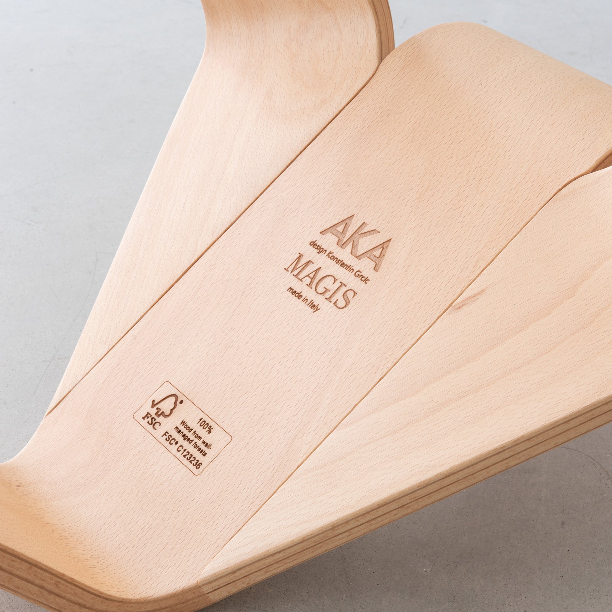 ビーチプライウッドの3パーツから構成され、中央部のパーツの切れ込みに、外側2つのパーツぴったりと収まることで、無駄のないスッキリとしたシルエットを実現。中央のパーツは背もたれのように上に向かって伸び、ハンドルやひじ掛けとしても機能します。