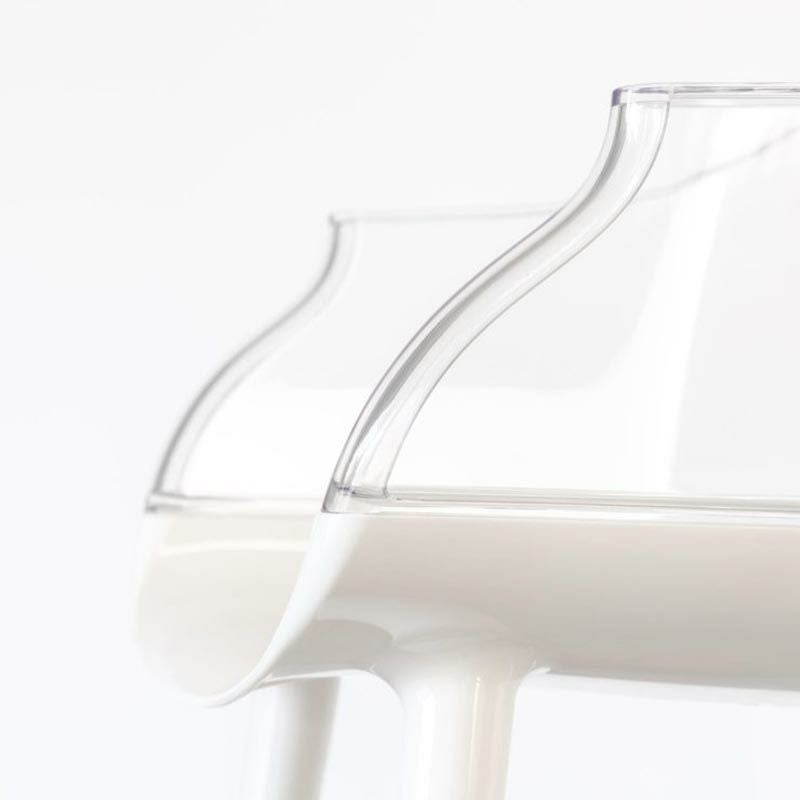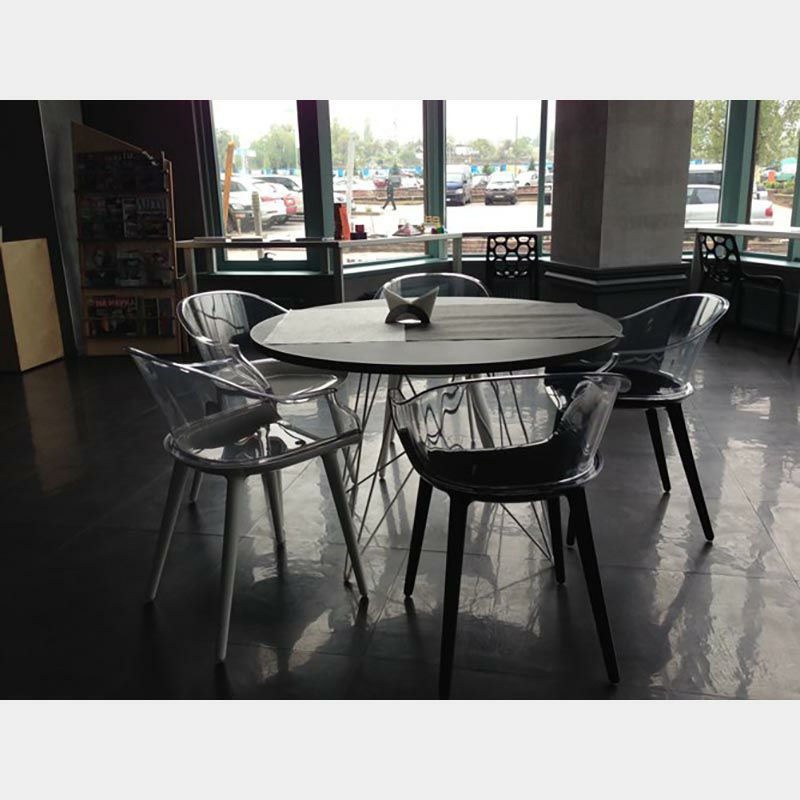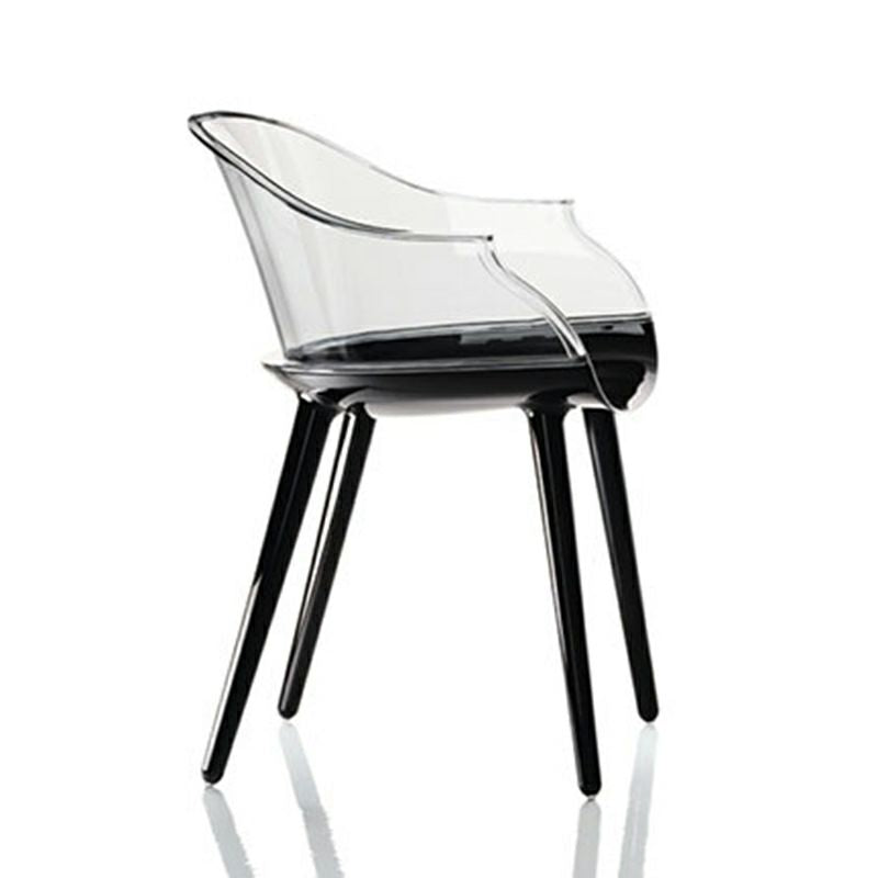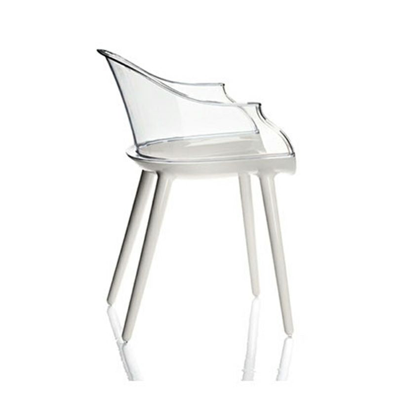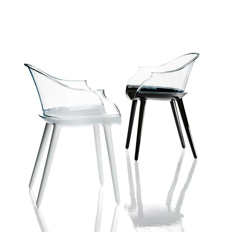 背と座それぞれがポリカーボネイトで作られたこのチェアは、同一素材ながら透明部分・不透明部分を使い分けファッショナブルに仕上げられています。