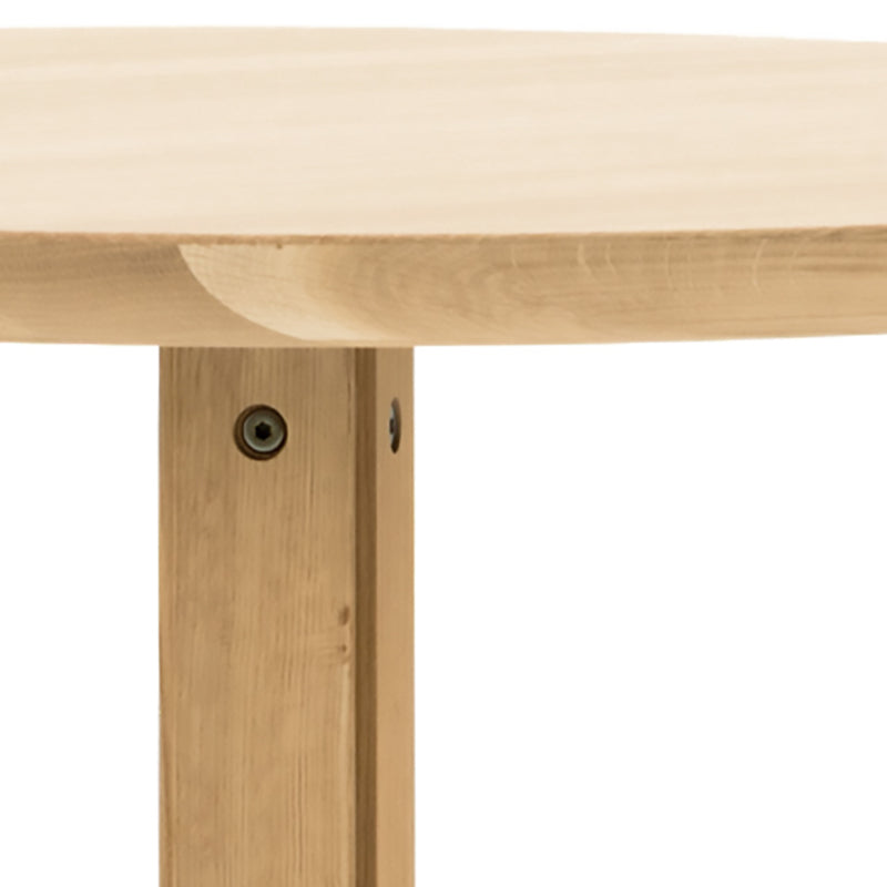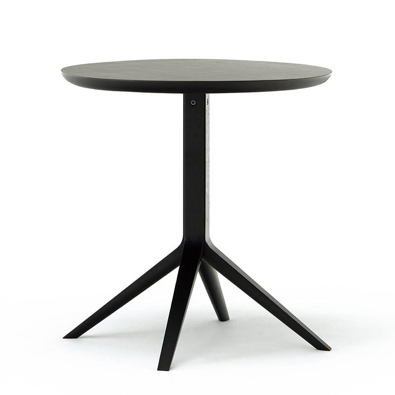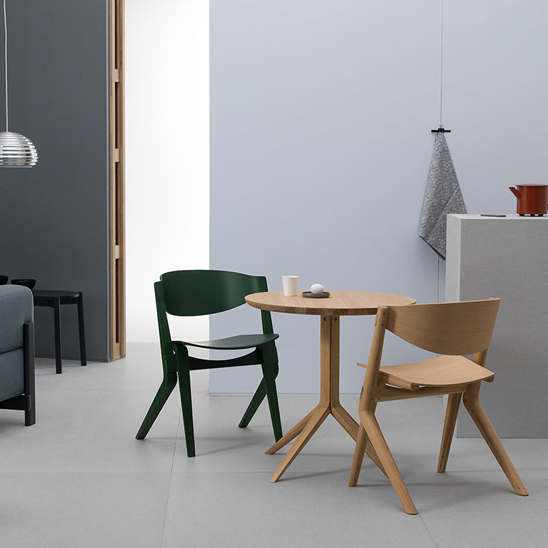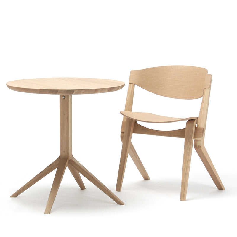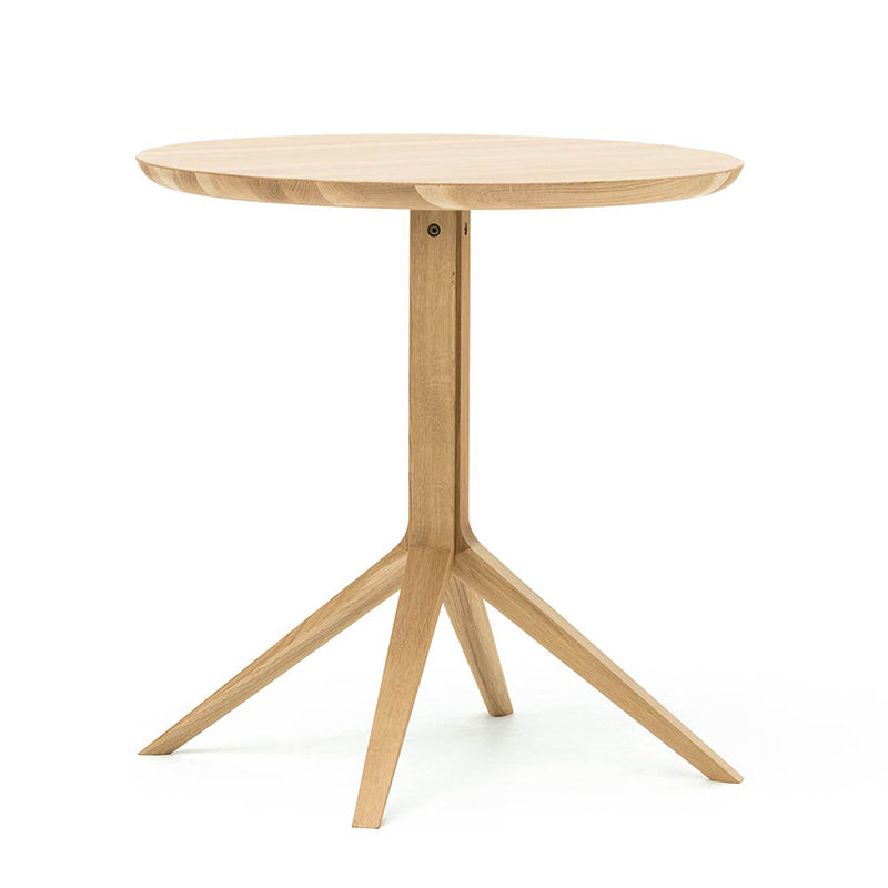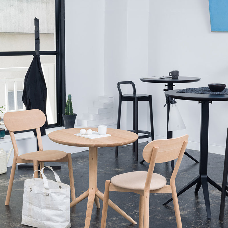Scout Chairの特徴的なディテールを採用しているものの、シンプルでエレガントな外見なので、色々なデザインの椅子に合わせやすいテーブルです。国産ナラ材を使用しており、天板と脚部は、スチールパーツで固定されています。バー、ダイニング、ローの3種類の高さと2種類のカラー展開です。コンパクトなサイズで、カフェやレストラン、オフィスのミーティングスペース、家の小さなリビングスペースなどにぴったりです。バーテーブルには木製の荷物かけが脚に取り付けられています。