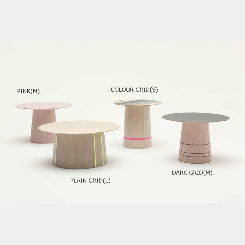 このColour Wood Plain は4つのスタイルで構成されていて、それぞれがカラー、高さ、直径の独自の組み合わせとなっています。ベースとなる部分は、日本古来の技法「雇い実接ぎ(やといさねつぎ)」を応用し、台形にカットされたパーツを独特な樽形状となるようにつなぎ合わせて構成されています。