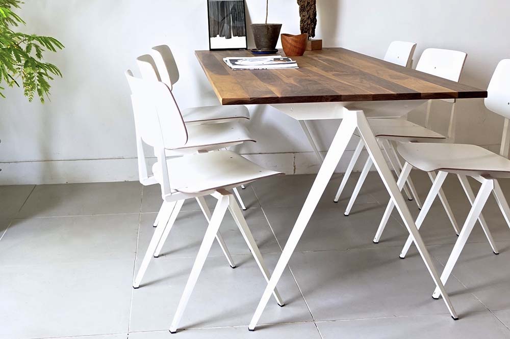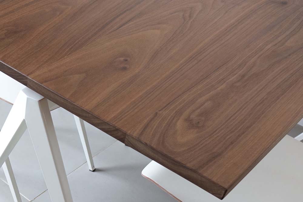モデルS.16チェアと同様の6バリエーションの定番スチールレッグに加え、天板の材質はオーク、ウォールナット無垢材の2種類、それぞれ幅1800mmと1400mmの2サイズを展開しております。