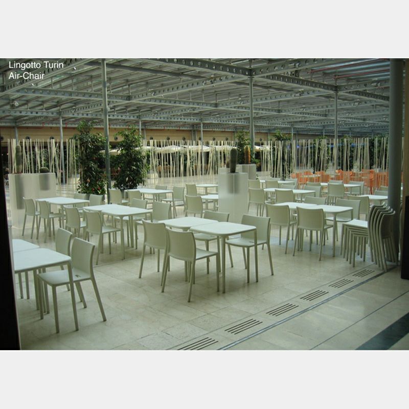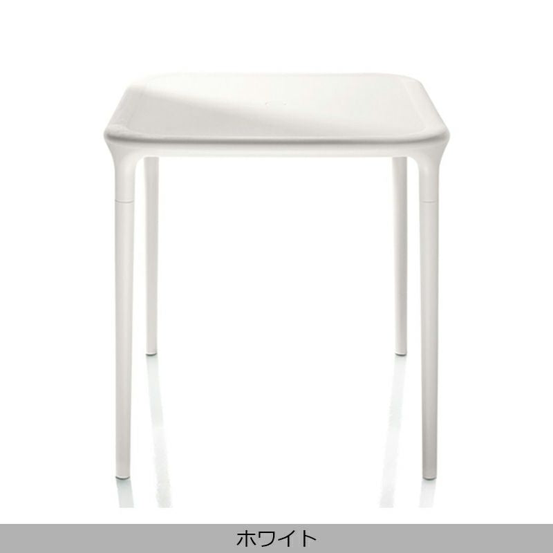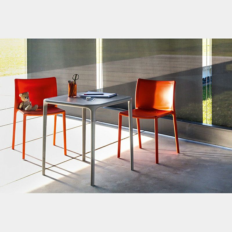 「Air」という名にふさわしい、軽やかで無駄のない軽快なフォルム。5脚までスタッキング(積重ね)が出来るので使わないときは重ねて収納ができ、もちろん屋外でも使用が可能。テーブル中央にはキャップで開閉できる、パラソル用の穴も開いています。