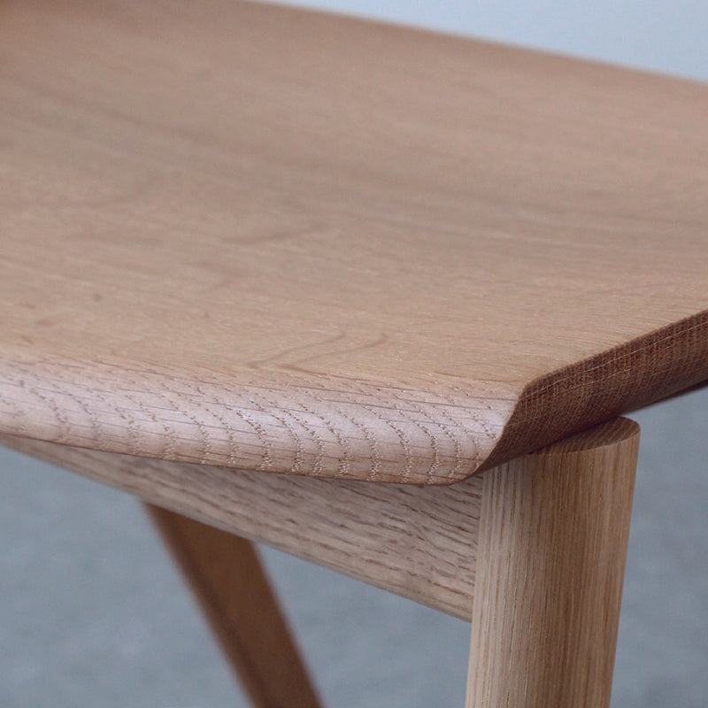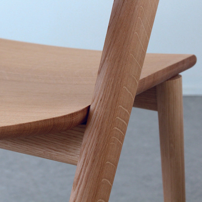 ウッドシートは前の上面が丸みを帯び、もも裏の当たりが優しくなっています。座面の横から後へかけて下面が丸みを帯び、椅子を引く時など触れる指に優しい設計です。